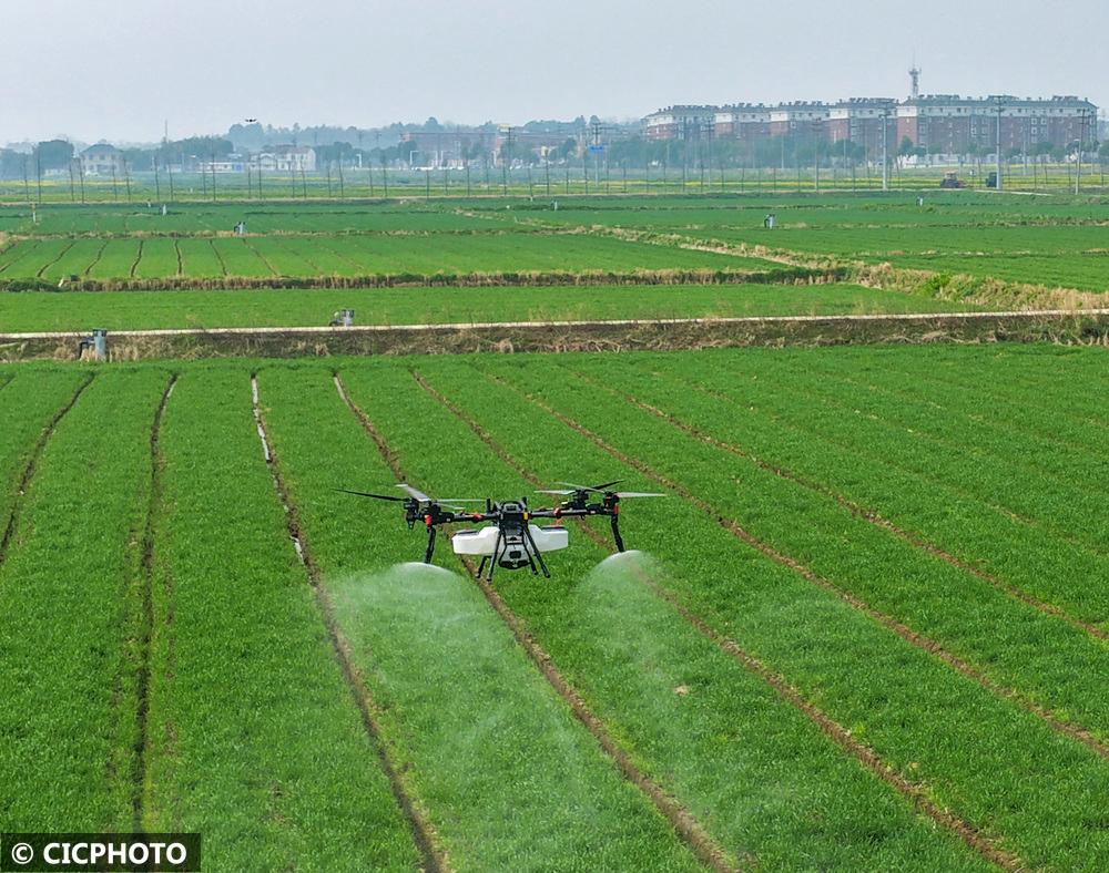 ↑2026年2月27日,植保无人机在四川省广安市广安区井河镇英雄村麦田里作业。CICPHOTO/廖小兵 摄