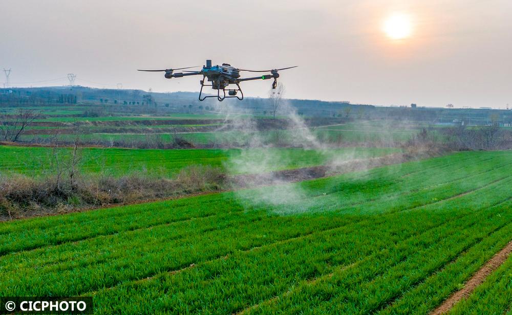 ↑2026年3月3日,植保无人机在河南省洛阳市伊滨区诸葛镇陈沟社区麦田里作业。(无人机照片)CICPHOTO/张怡熙 摄