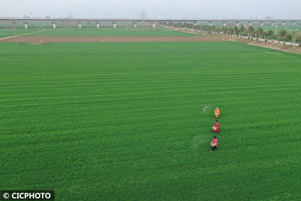 ↑2026年2月28日,安徽省亳州市利辛县中疃镇高皇社区农民在麦田里追施返青肥。(无人机照片)CICPHOTO/刘杰 摄