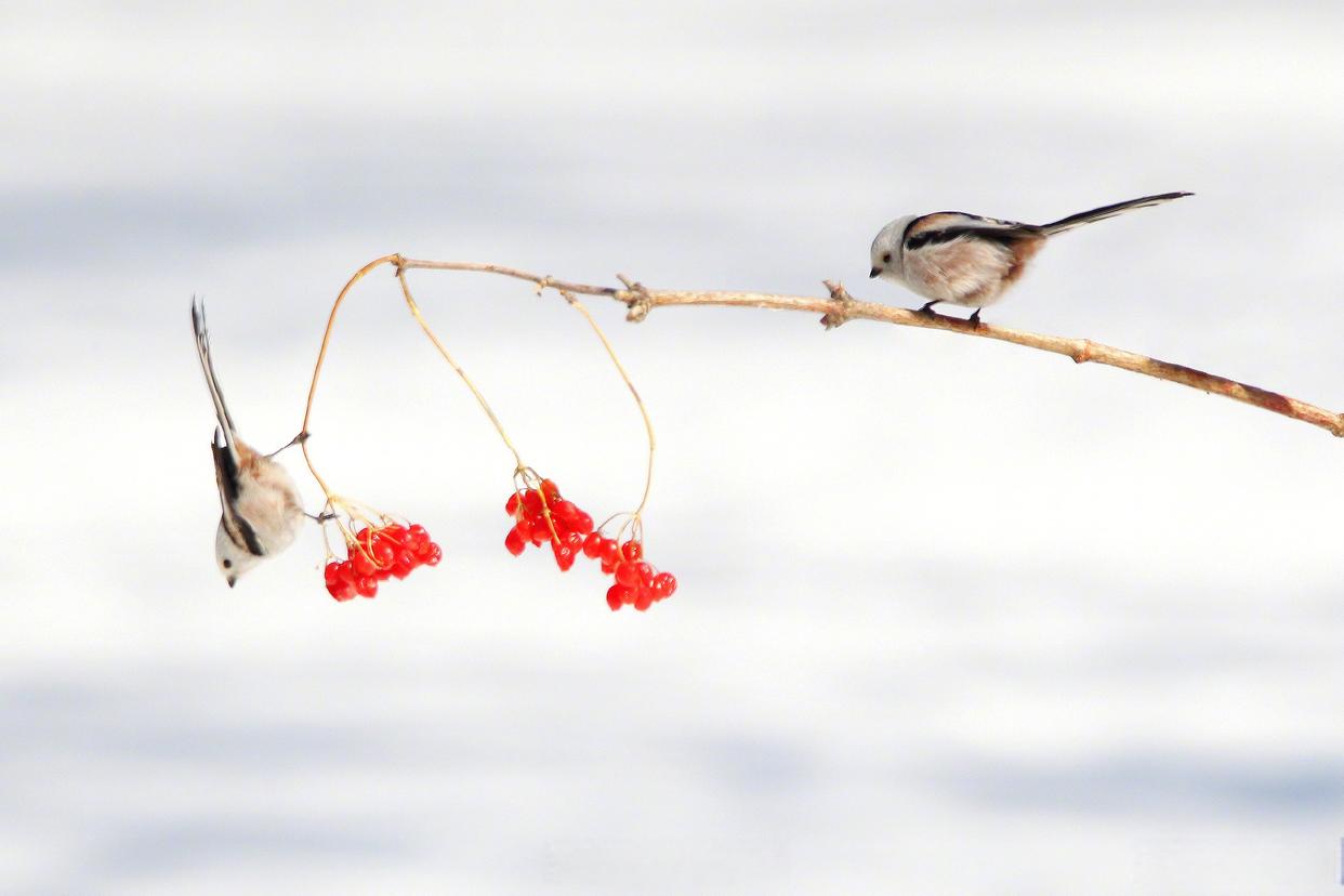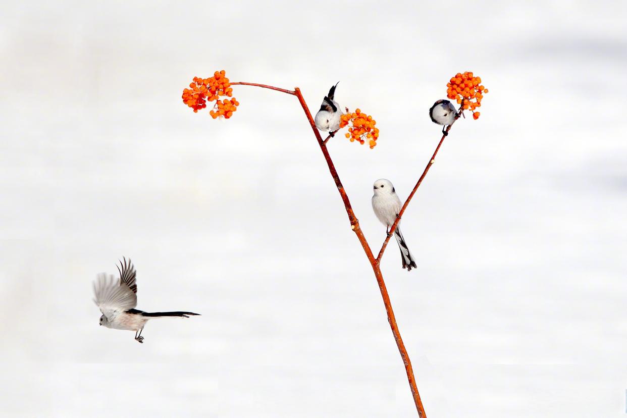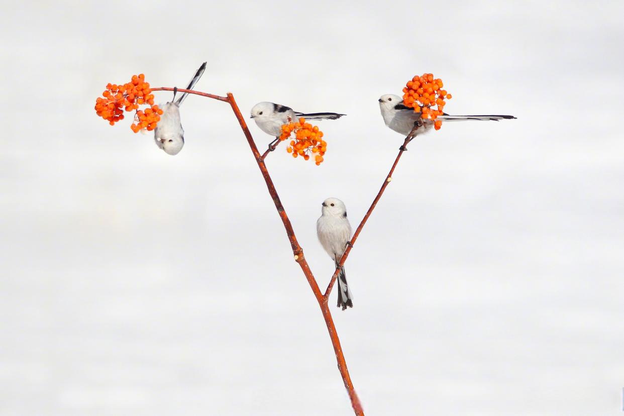 雪地小鸟嬉戏图好可爱 近日,黑龙江大庆城市森林公园雪地林间,小鸟在枝头嬉戏,画面灵动可爱。网友:好像是花鸟图照进了现实!