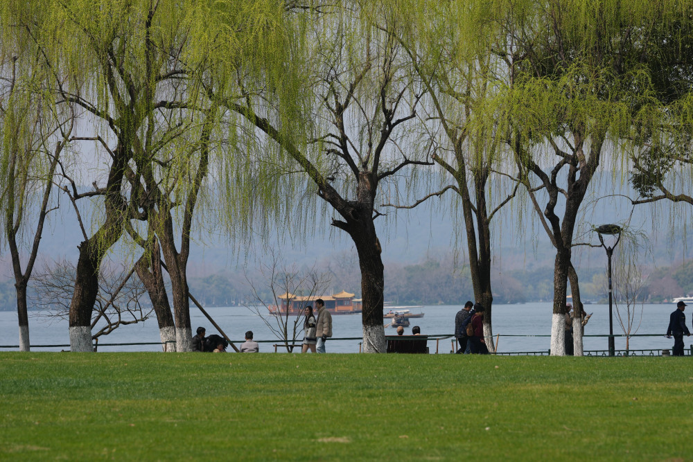 3月11日,游客在西湖边漫步游览,柳枝已抽出嫩芽。新华社记者 黄宗治 摄