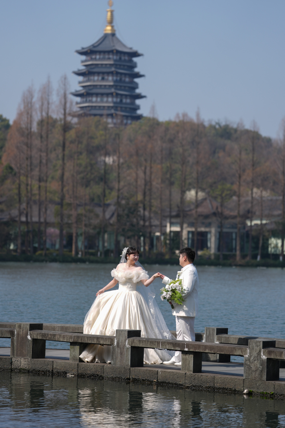 3月11日,一对新人在西湖景区长桥上以雷峰塔为背景拍摄婚纱照。新华社记者 黄宗治 摄