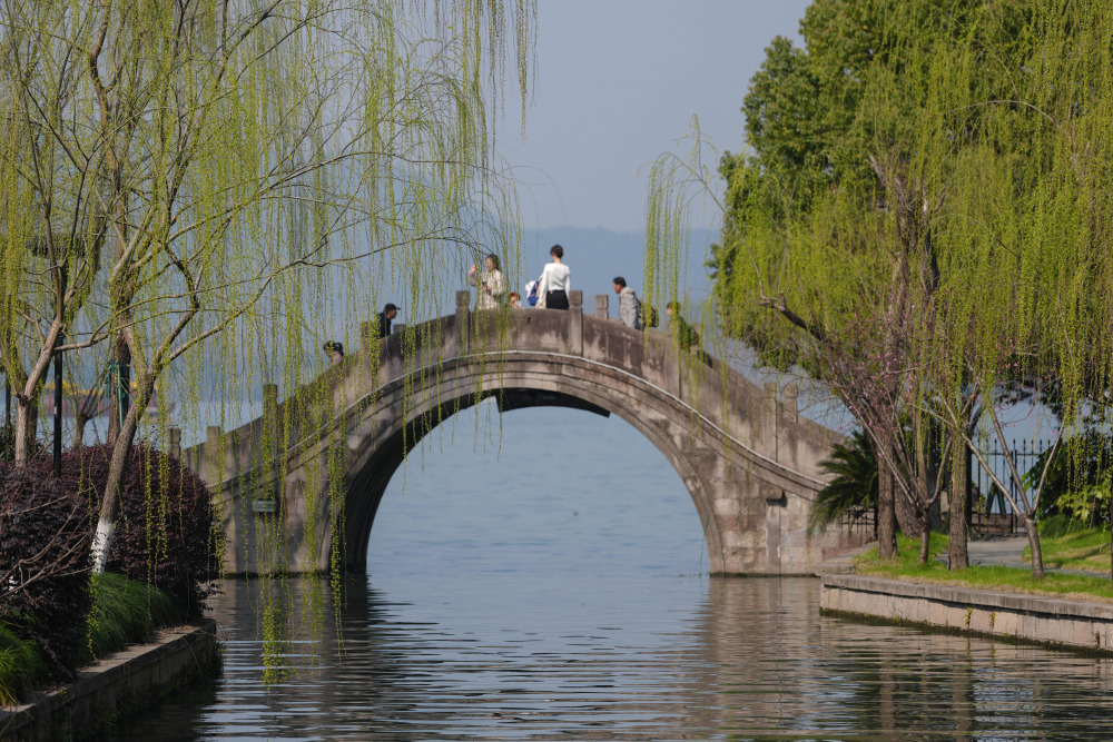 3月11日,游客在西湖景区一座石拱桥游览,西湖岸边的柳枝已抽出嫩芽。新华社记者 黄宗治 摄