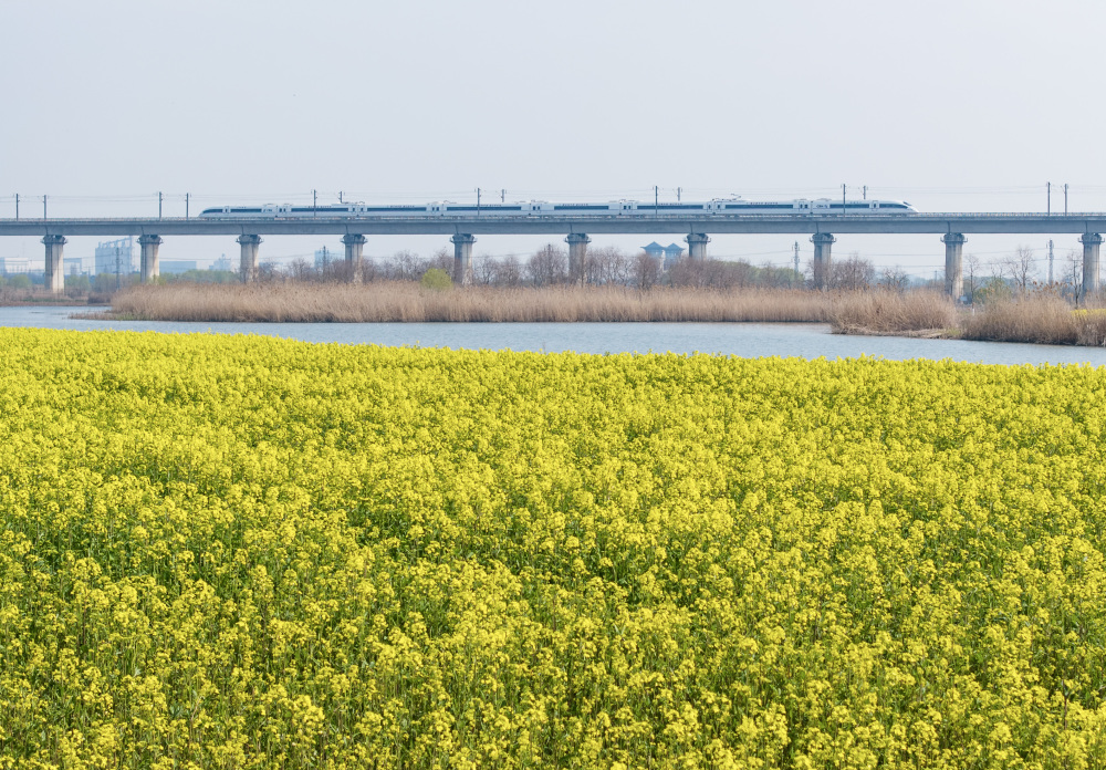 春日,在安徽省合肥市肥东县十八联圩生态湿地,油菜花竞相绽放,铺展成金色花海。高铁列车穿行其间,与碧水、飞鸟相映成趣,勾勒出一幅生动多彩的江淮大地春日图景。