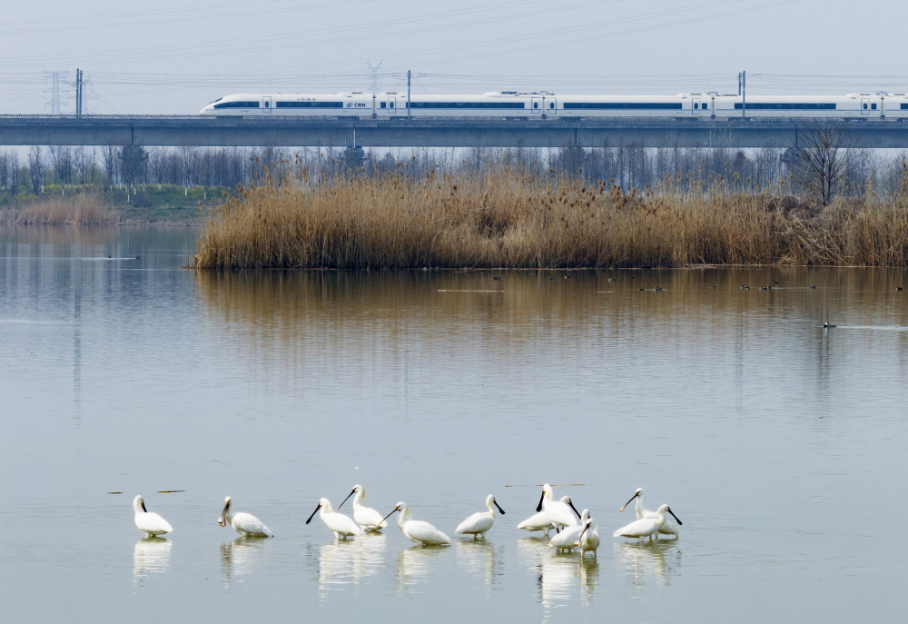 3月11日,一列高铁列车穿行在十八联圩生态湿地(无人机照片)。新华社记者 杜宇 摄