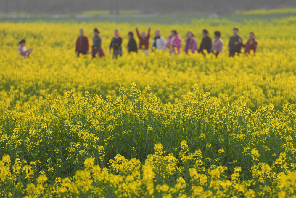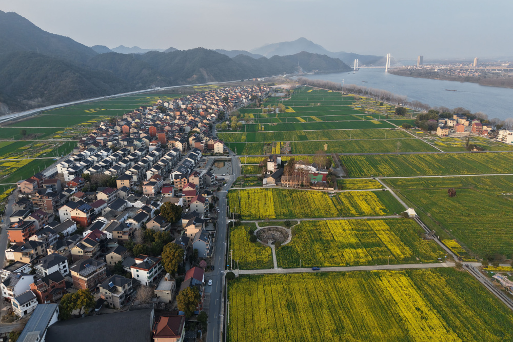 天气渐暖,位于富春江畔的浙江杭州桐庐县桐君街道梅蓉村千亩油菜花田进入盛开期,吸引不少游客前来观光游玩。