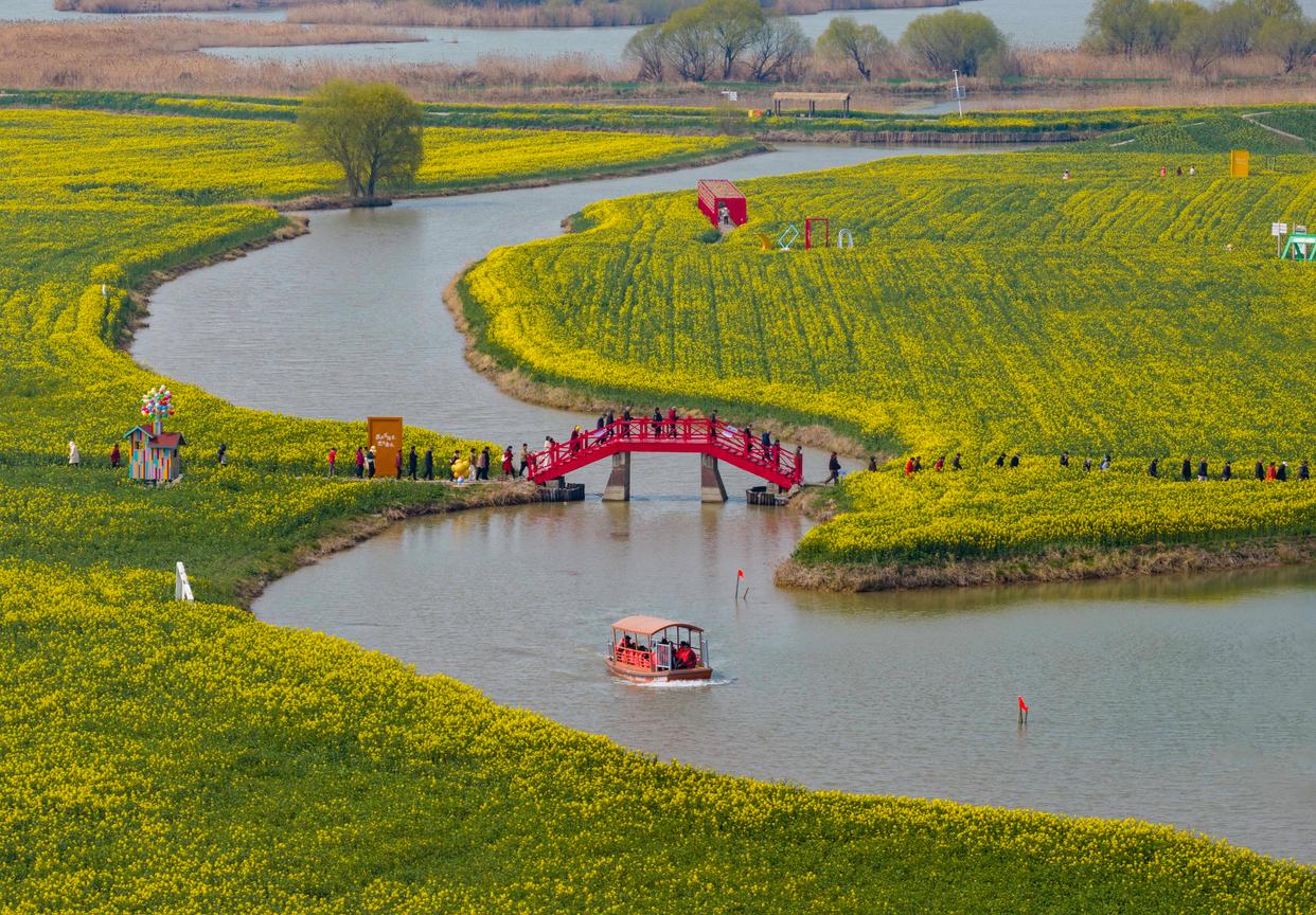 3月12日,游客在江苏省高邮市湖上花海景区赏花游玩(无人机照片)。新华社发(周社根摄)