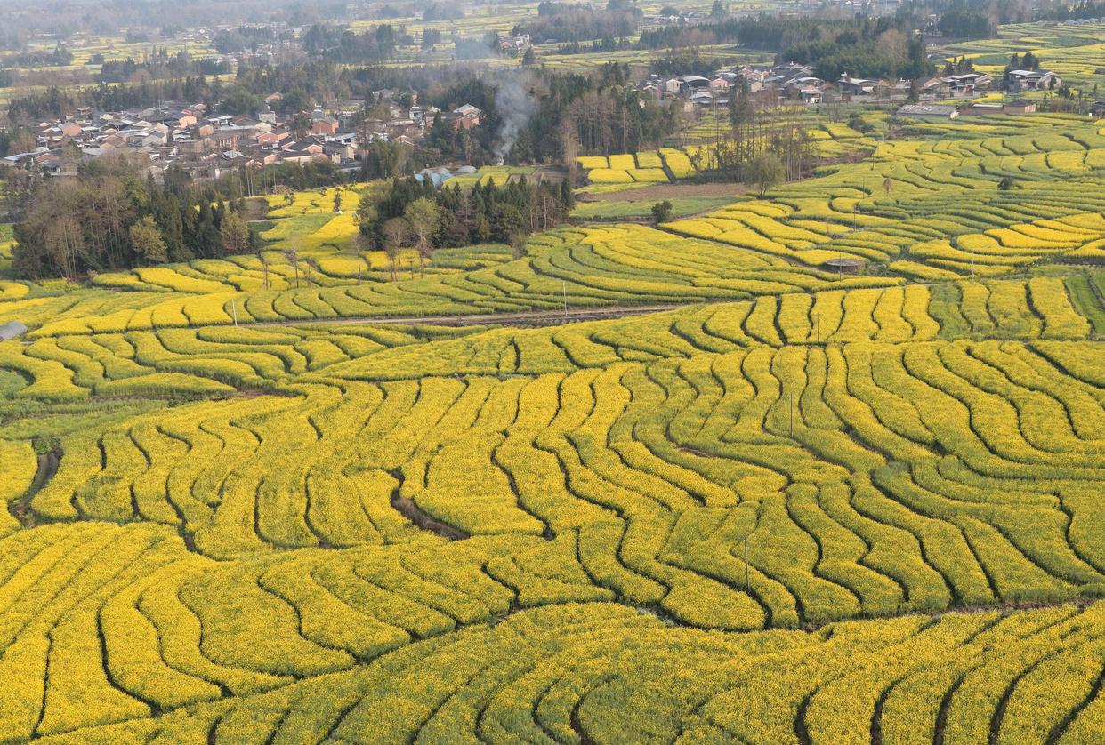 3月8日,游客在四川省广安市广安区花桥镇油菜花田间赏花游玩(无人机照片)。新华社发(张国盛摄)
