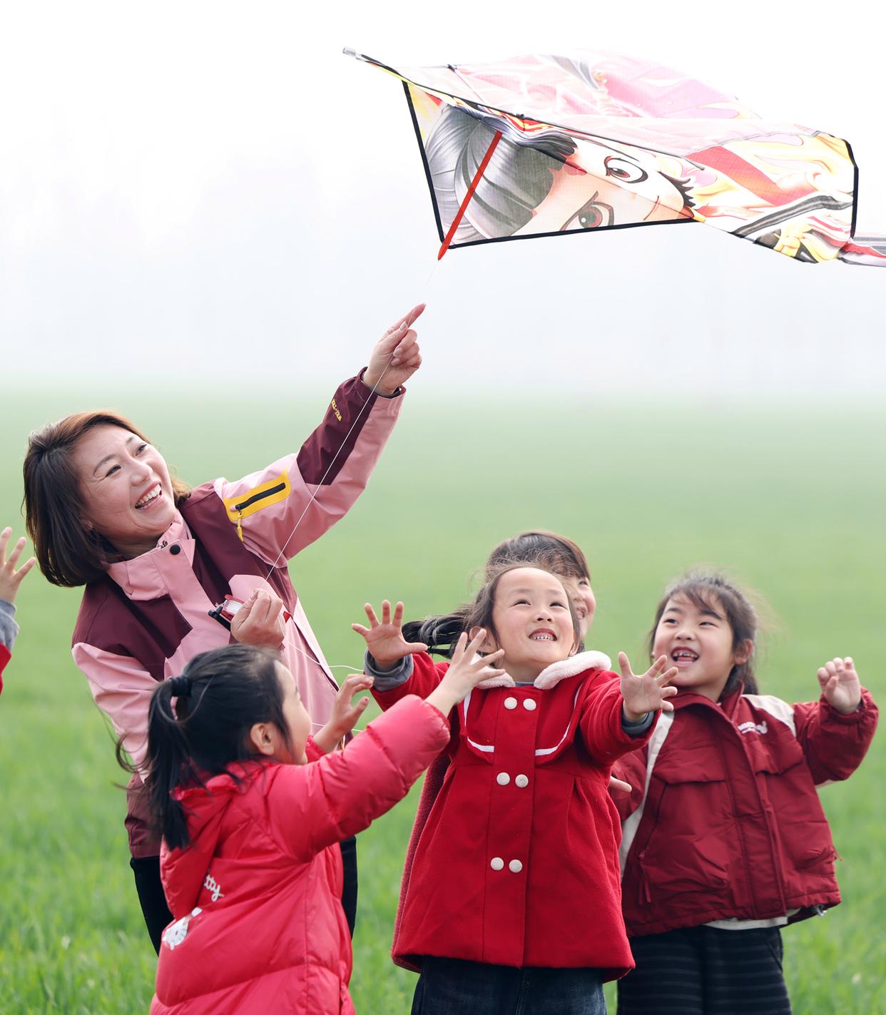 3月12日,山东省临沂市郯城县郯城街道官塘幼儿园的老师带着孩子放风筝。新华社发(张春雷摄)