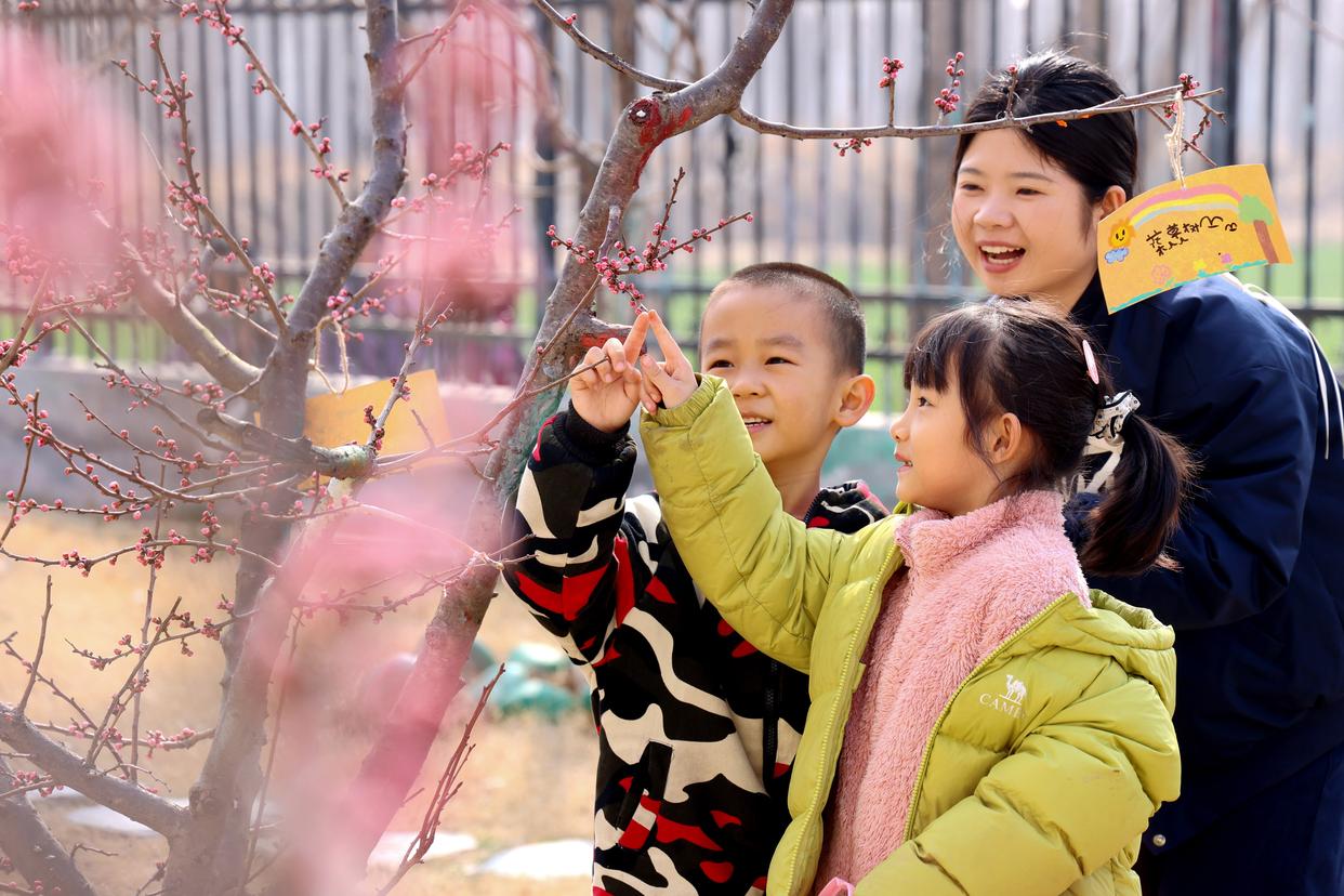 3月12日,山东省邹平市高新街道中心幼儿园的孩子们在室外观看树木的花苞。新华社发(董乃德摄)