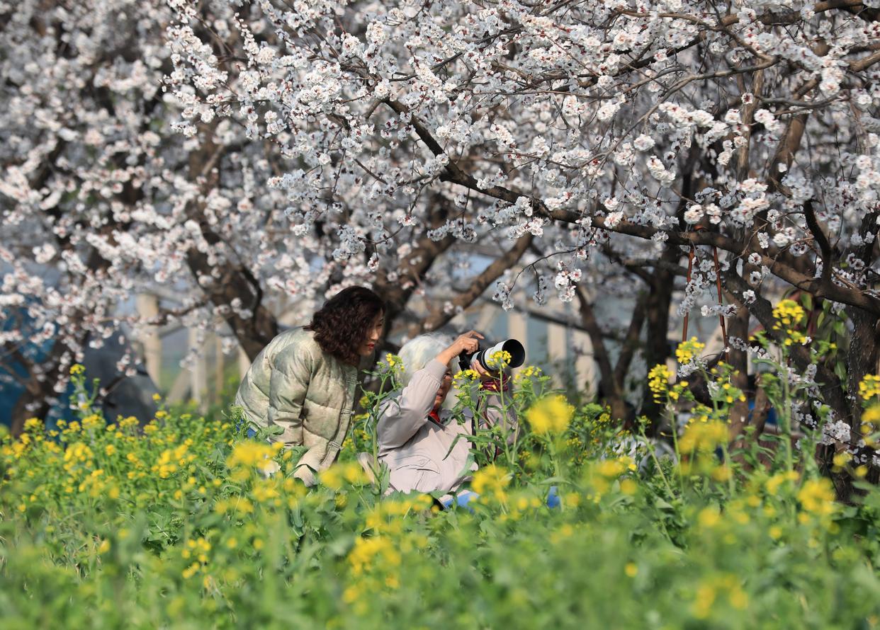 3月11日,游人在杏花盛开的河南省鹤壁市淇滨区泰山路街道办事处福田社区游玩拍照。新华社发(赵永强摄)