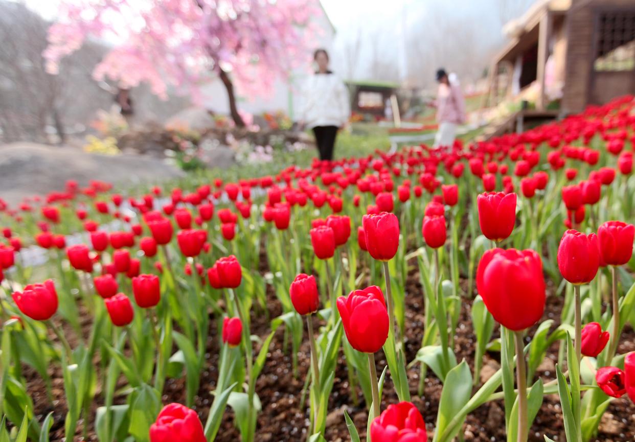 3月12日,游人在山东省临沂市沂蒙山天蒙旅游区赏花游玩。新华社发(武纪全摄)