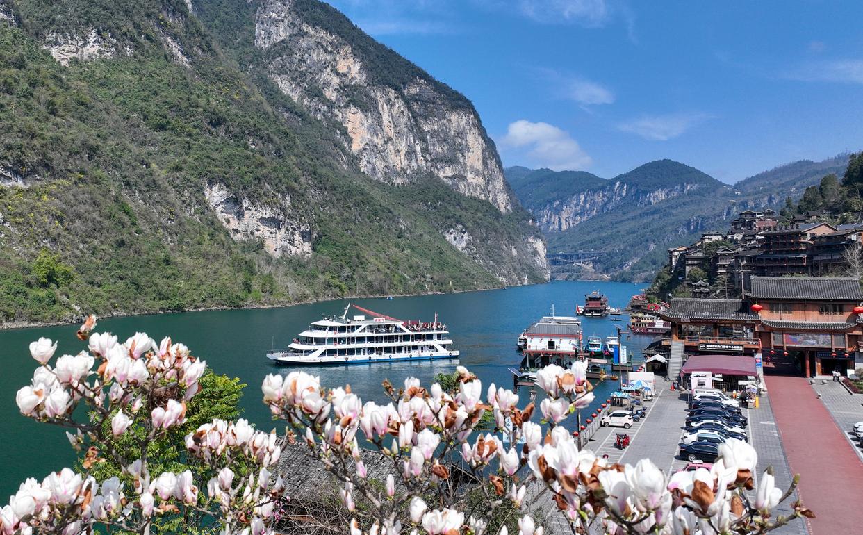 3月10日,游船行驶在乌江重庆市酉阳土家族苗族自治县龚滩古镇段(无人机照片)。新华社发(邱洪斌摄)
