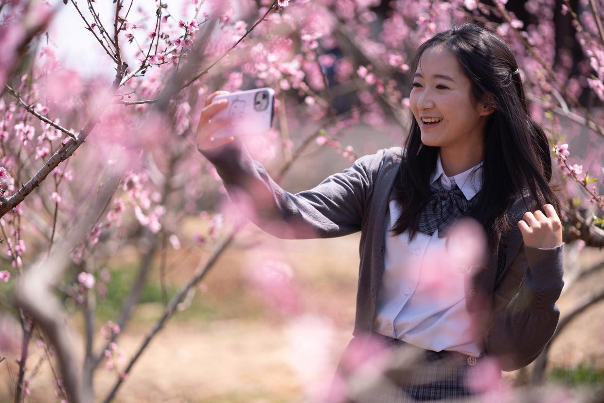 3月12日,游客在河南省焦作市温县黄河街道下石井村杏园赏花拍照。新华社发(黄福兴摄)