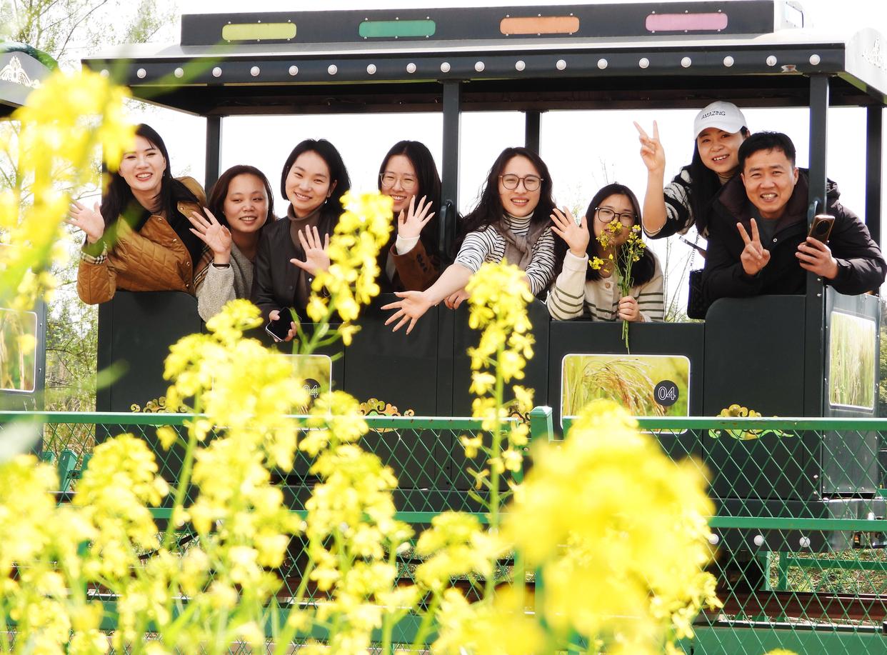 3月9日,在四川省达州市渠县有庆镇太阳村油菜花田间,游客乘坐小火车观赏油菜花。新华社发(邓良奎摄)