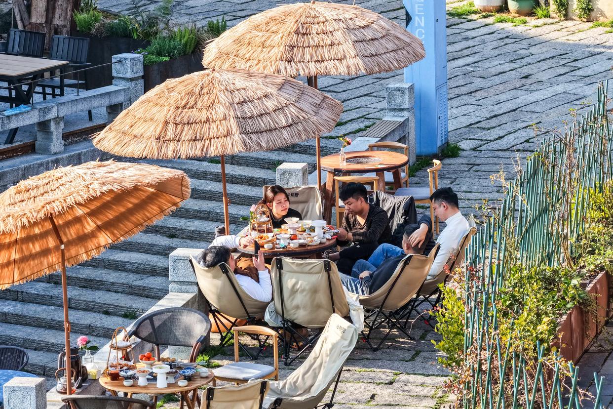 3月11日,游客在穿紫河畔的常德河街品茶。新华社记者 陈思汗 摄