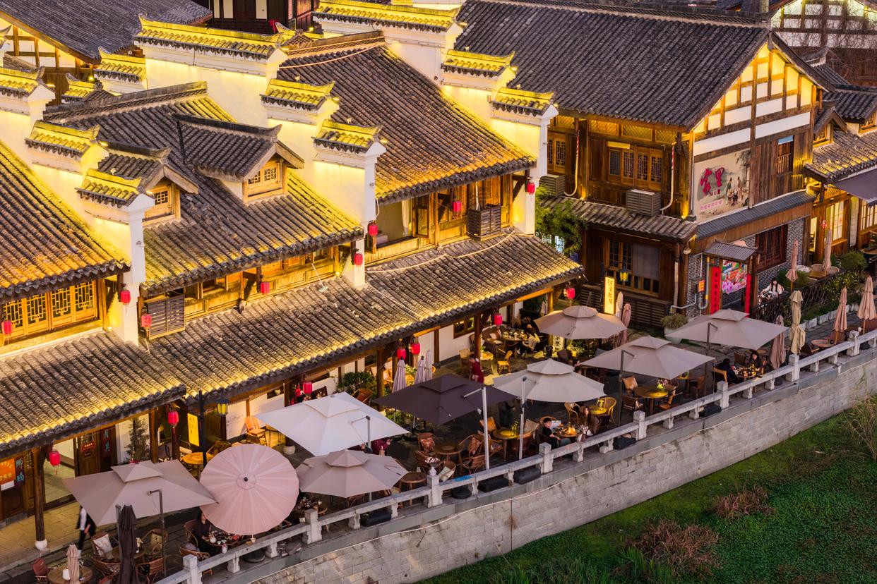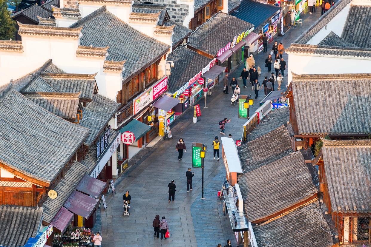 3月11日,游客在穿紫河畔的常德河街游玩(无人机照片)。新华社记者 陈思汗 摄