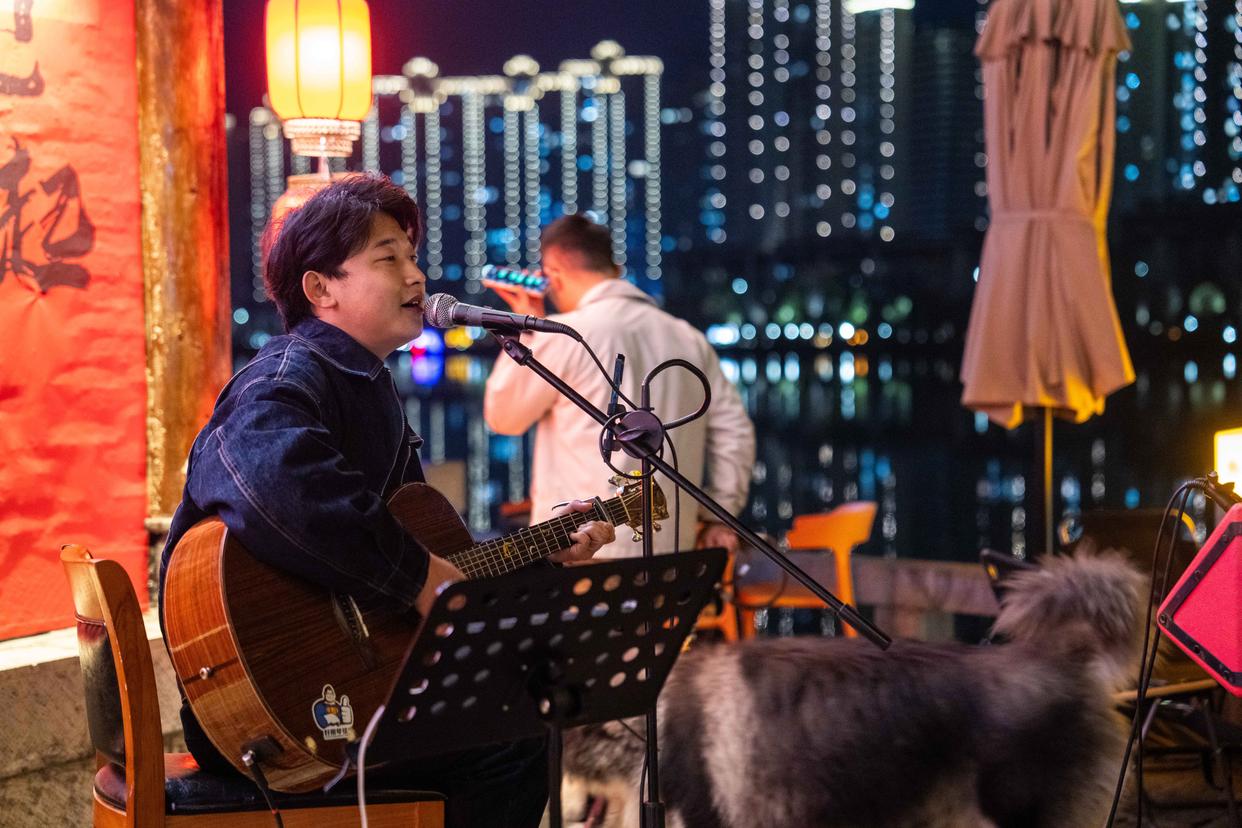 3月10日,歌手在穿紫河畔的常德河街弹唱。新华社记者 陈思汗 摄
