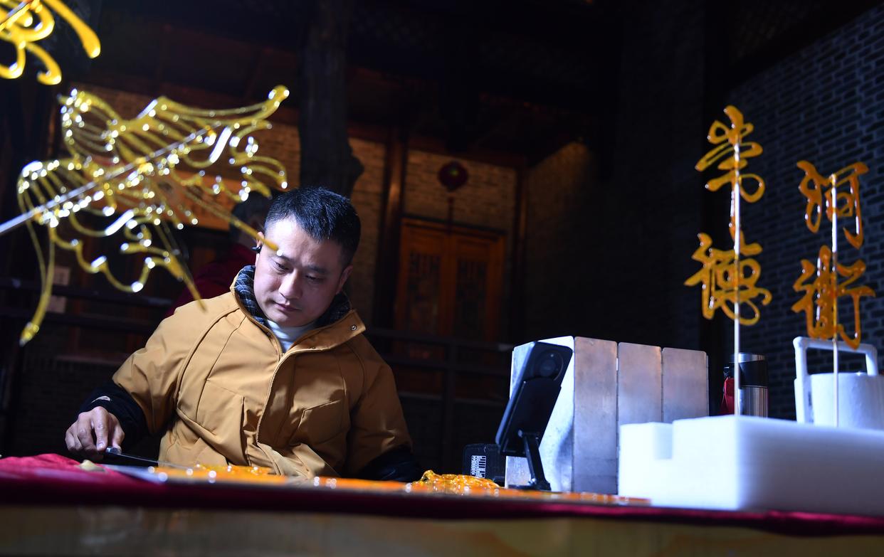 3月11日,一名手艺人在穿紫河畔的常德河街制作“糖画”。新华社记者 赵仲志 摄