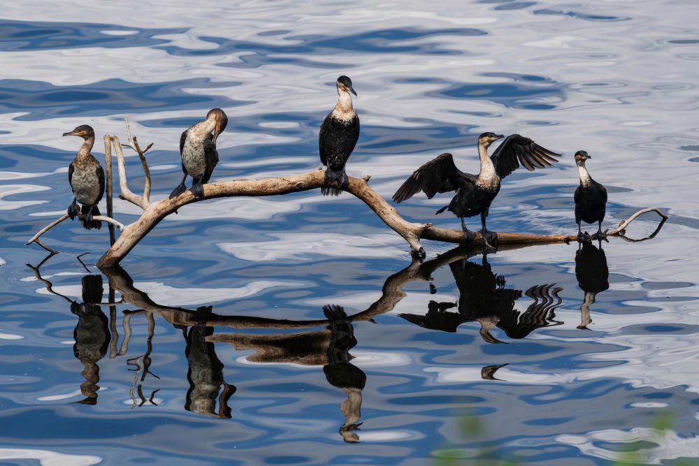 ↑在肯尼亚纳库鲁湖国家公园,一群鸬鹚在水面上停歇(3月2日摄)。