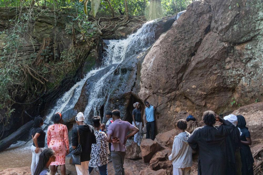 ↑在肯尼亚首都内罗毕,人们在卡鲁拉森林中的一处瀑布前游览(1月25日摄)。