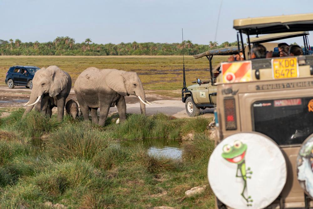 ↑游客在肯尼亚安博塞利国家公园乘车观看大象(1月8日摄)。