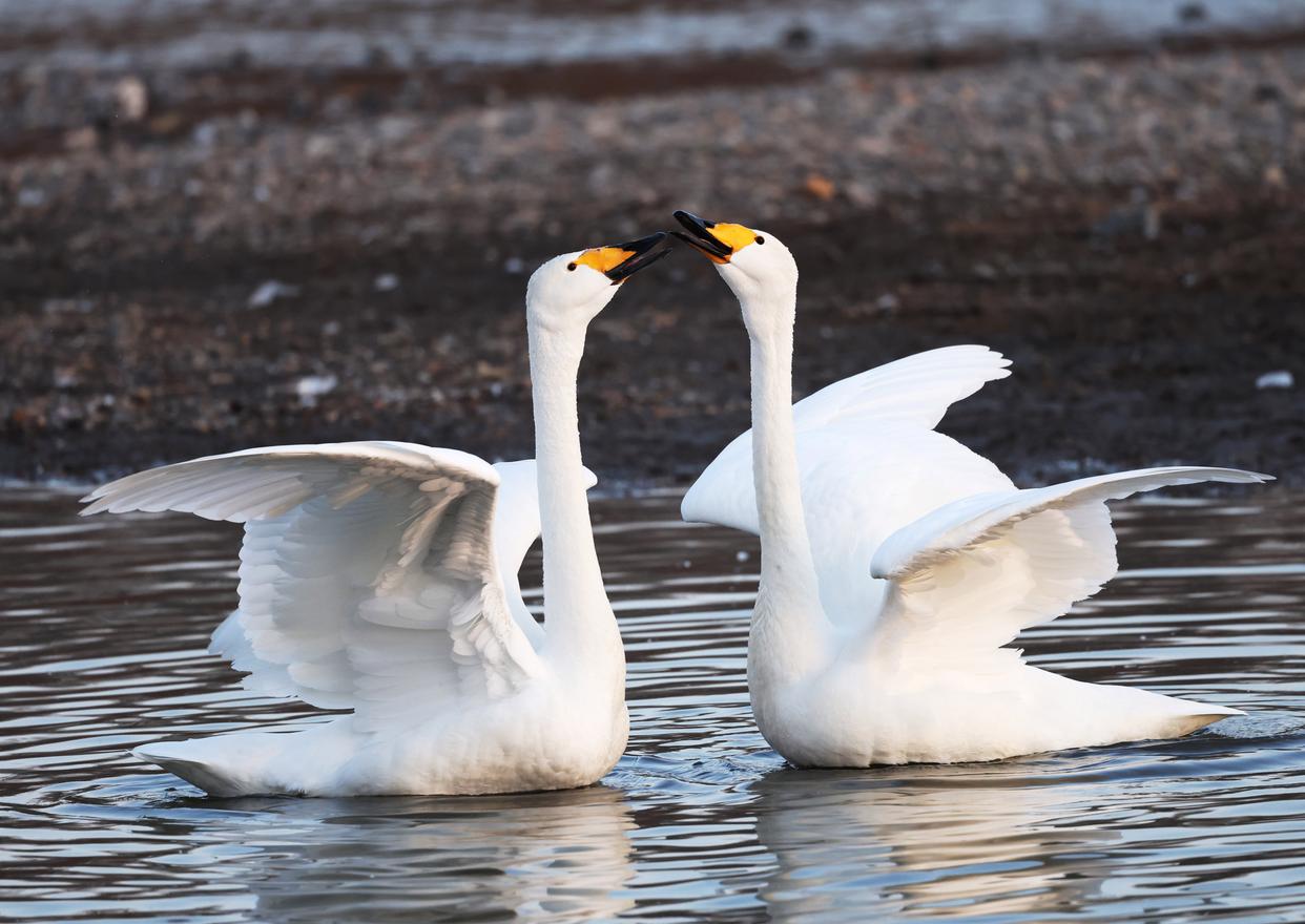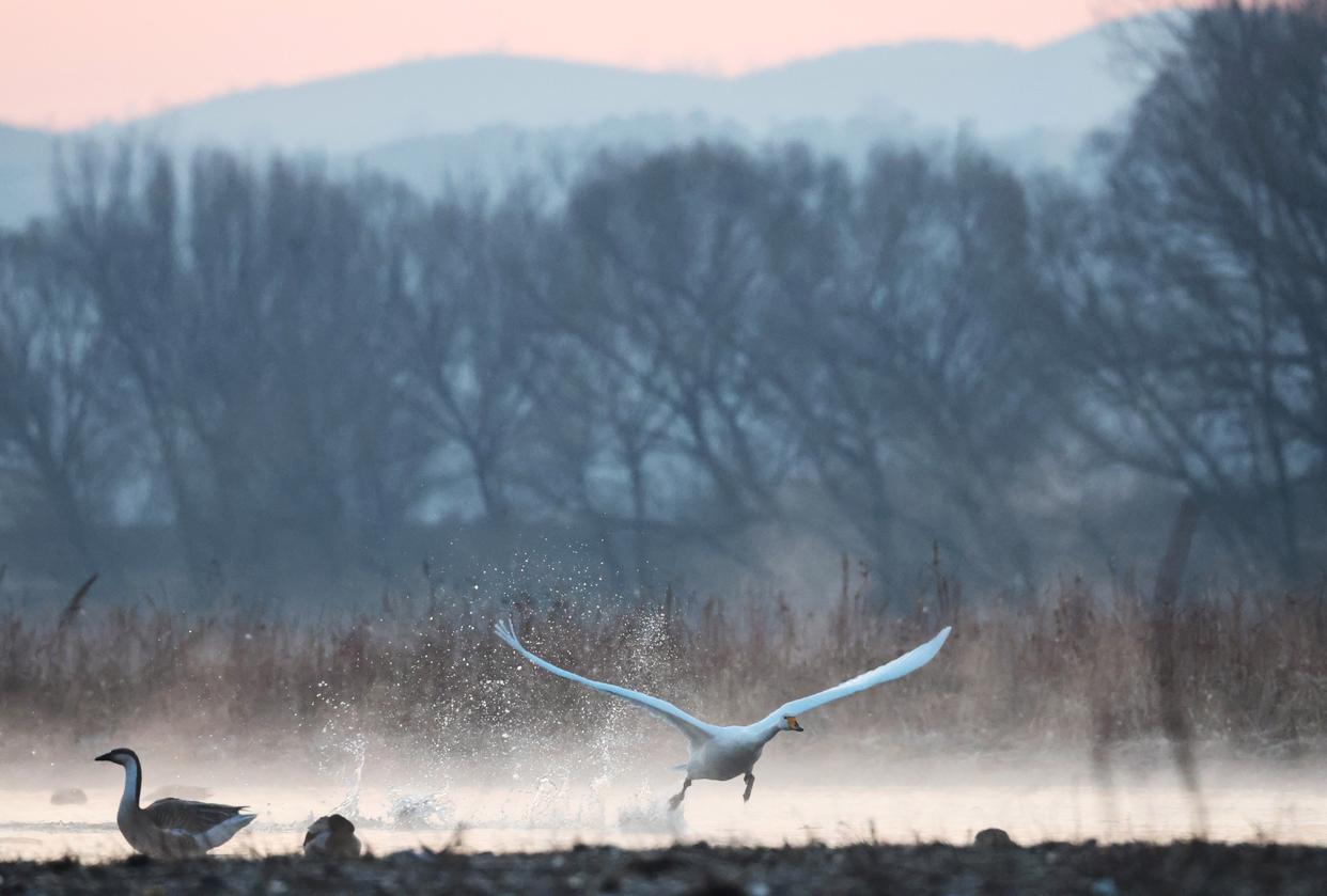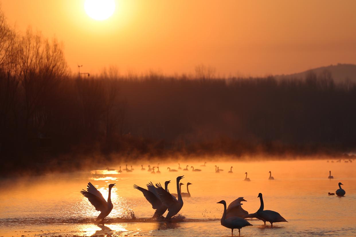 惊蛰节气过后,大批天鹅在辽宁省北票市红村天鹅湾栖息停歇,吸引人们前来观赏和拍照。