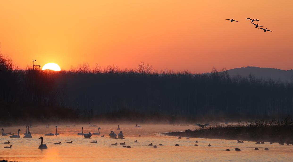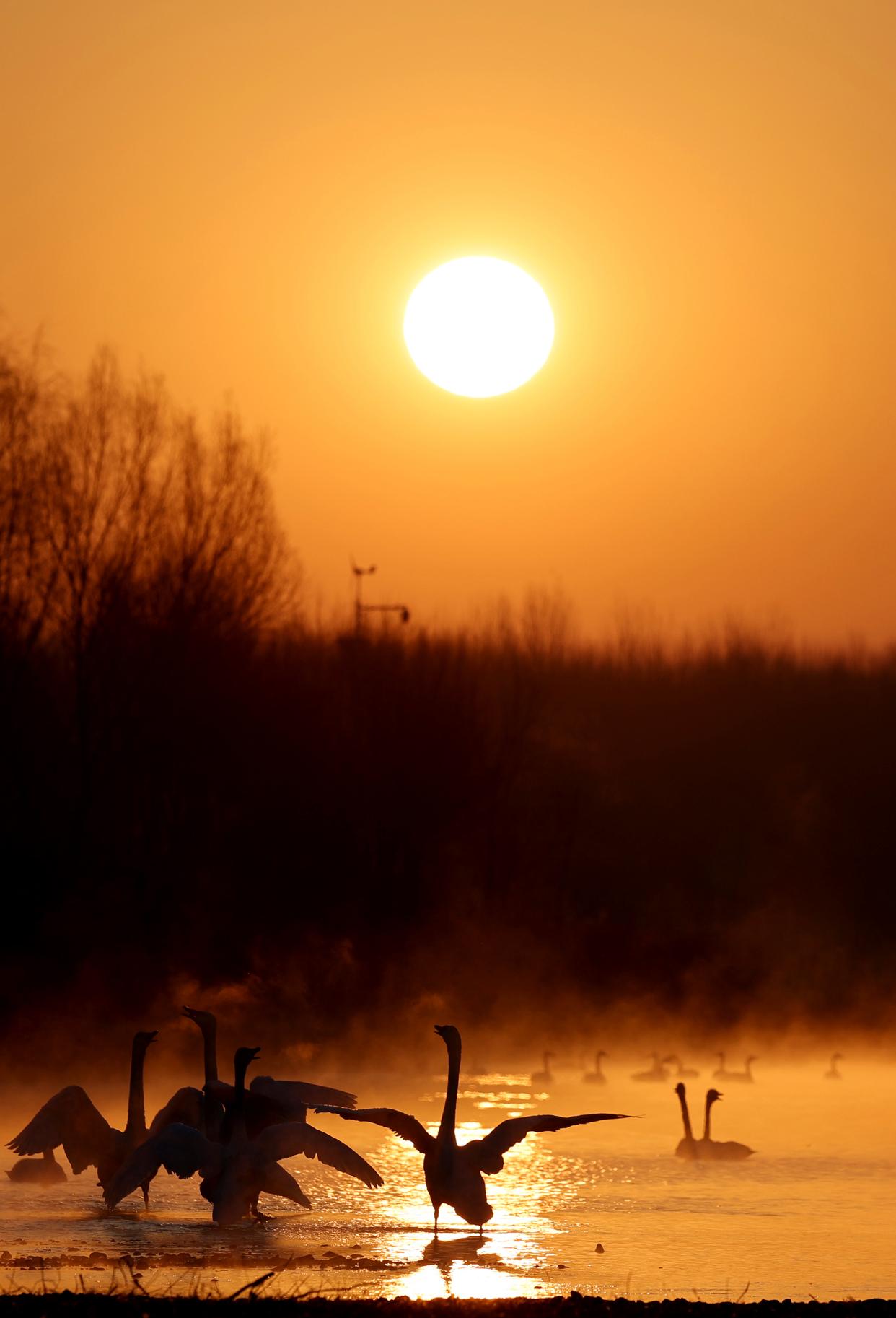 3月12日清晨,天鹅在辽宁省北票市红村天鹅湾栖息。新华社记者 李钢 摄