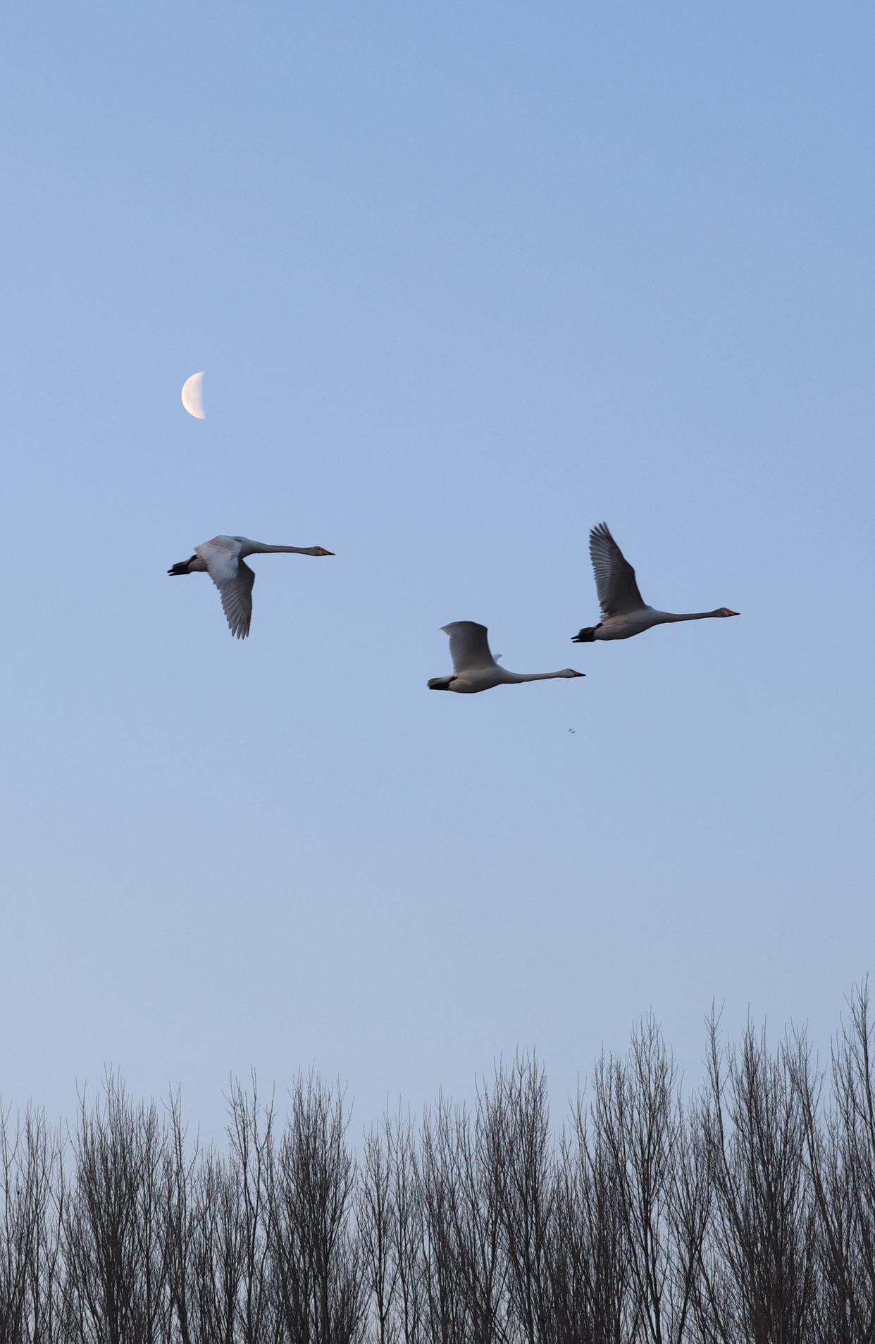 3月11日,天鹅在辽宁省北票市红村天鹅湾飞翔。新华社记者 李钢 摄