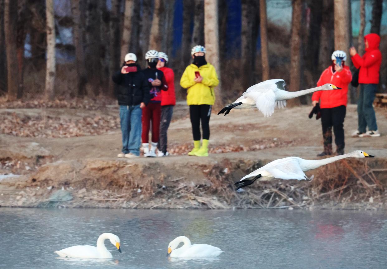 3月12日,人们在辽宁省北票市红村天鹅湾观赏天鹅。新华社记者 李钢 摄
