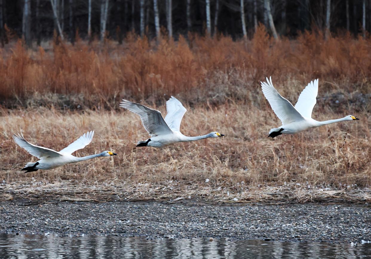 3月12日,天鹅在辽宁省北票市红村天鹅湾飞翔。新华社记者 李钢 摄
