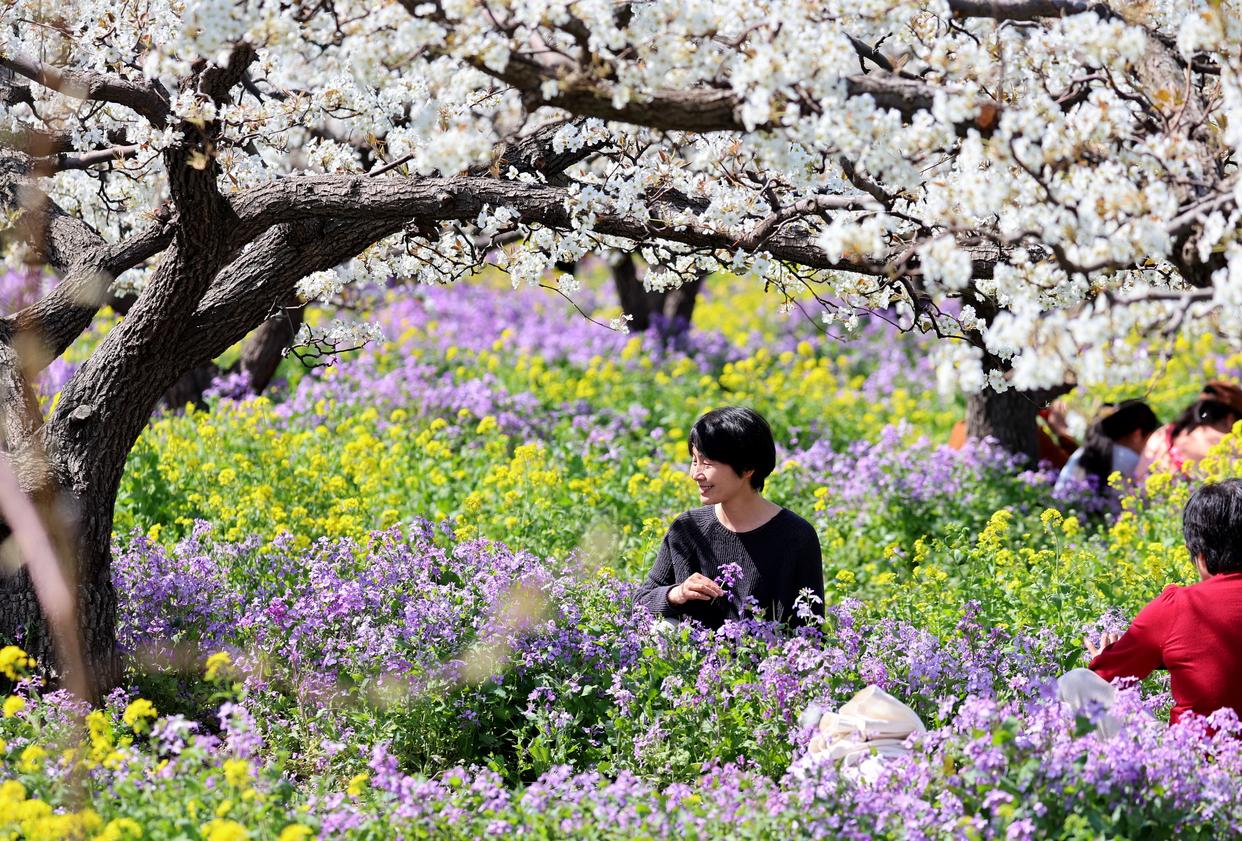 游客在河北省晋州市周家庄乡第九生产队梨园赏花在春日里