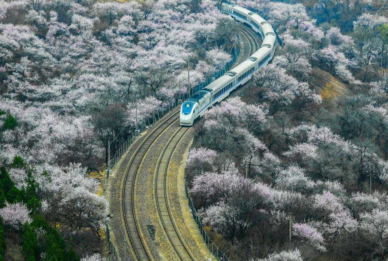 每年三月中下旬开始,在北京居庸关长城脚下,山花相继绽放。北京市郊铁路S2线的一列列火车穿行于花海间,成为春日里的一道美丽风景。
