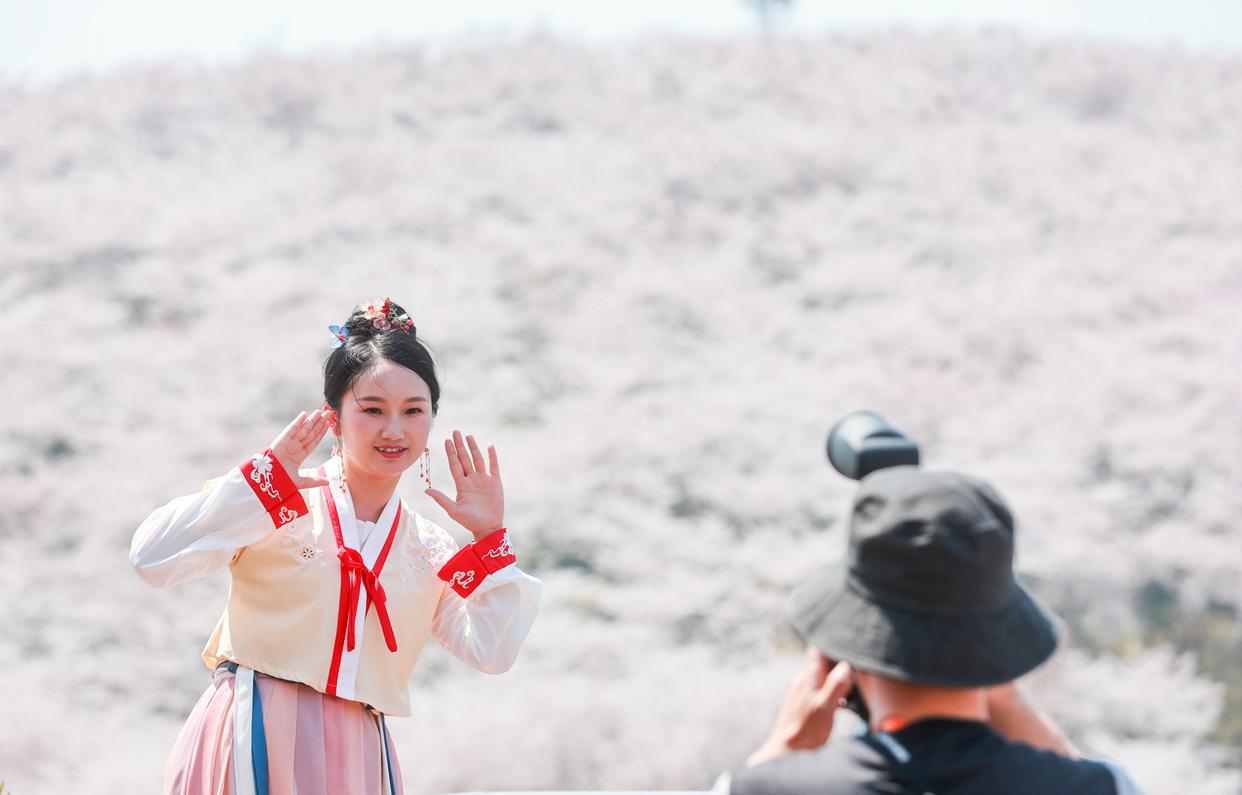游客在贵州省贵安新区樱花园内赏花拍照