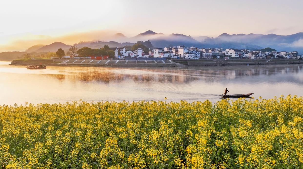 安徽省黄山市歙县新安江畔的油菜花竞相绽放