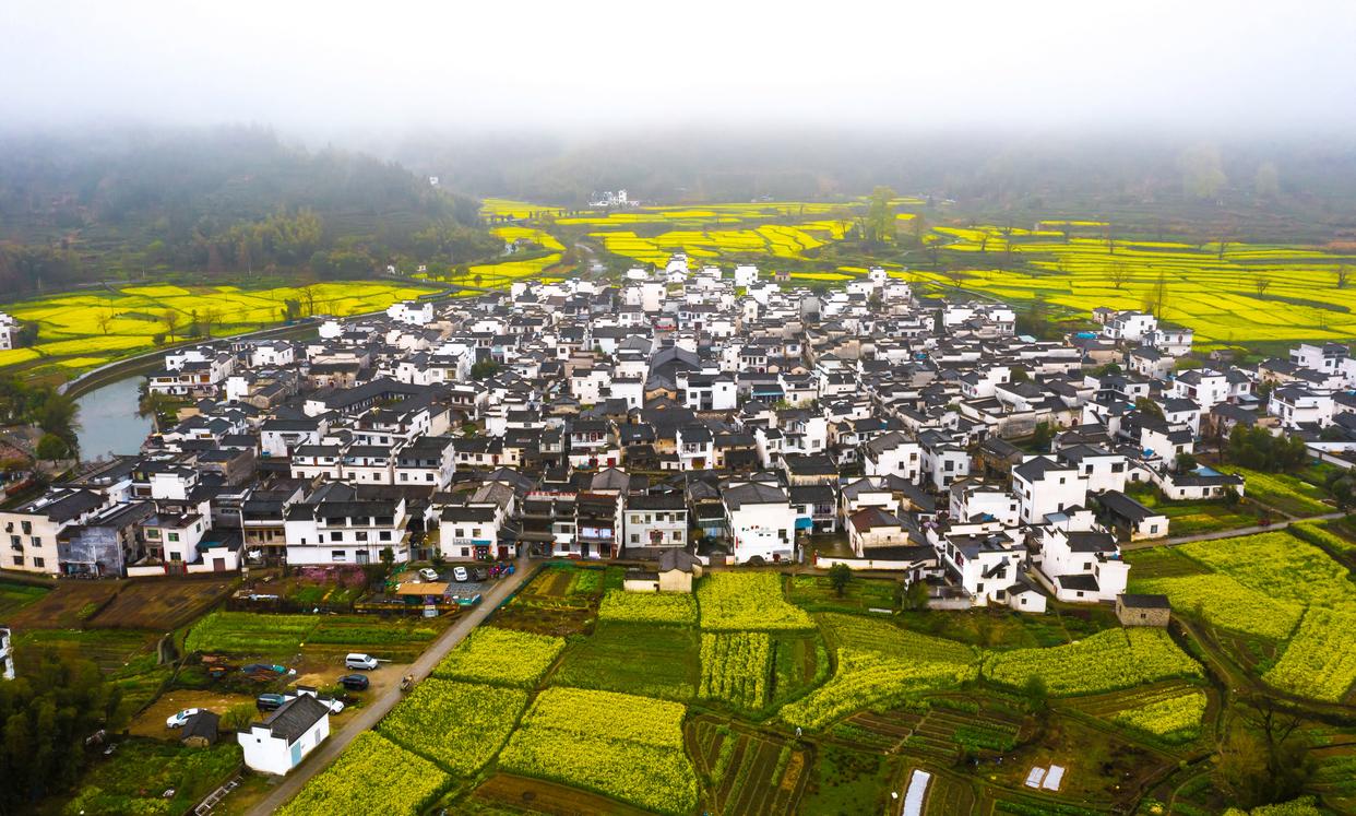 安徽黟县卢村的油菜花与村里的房屋互相点缀