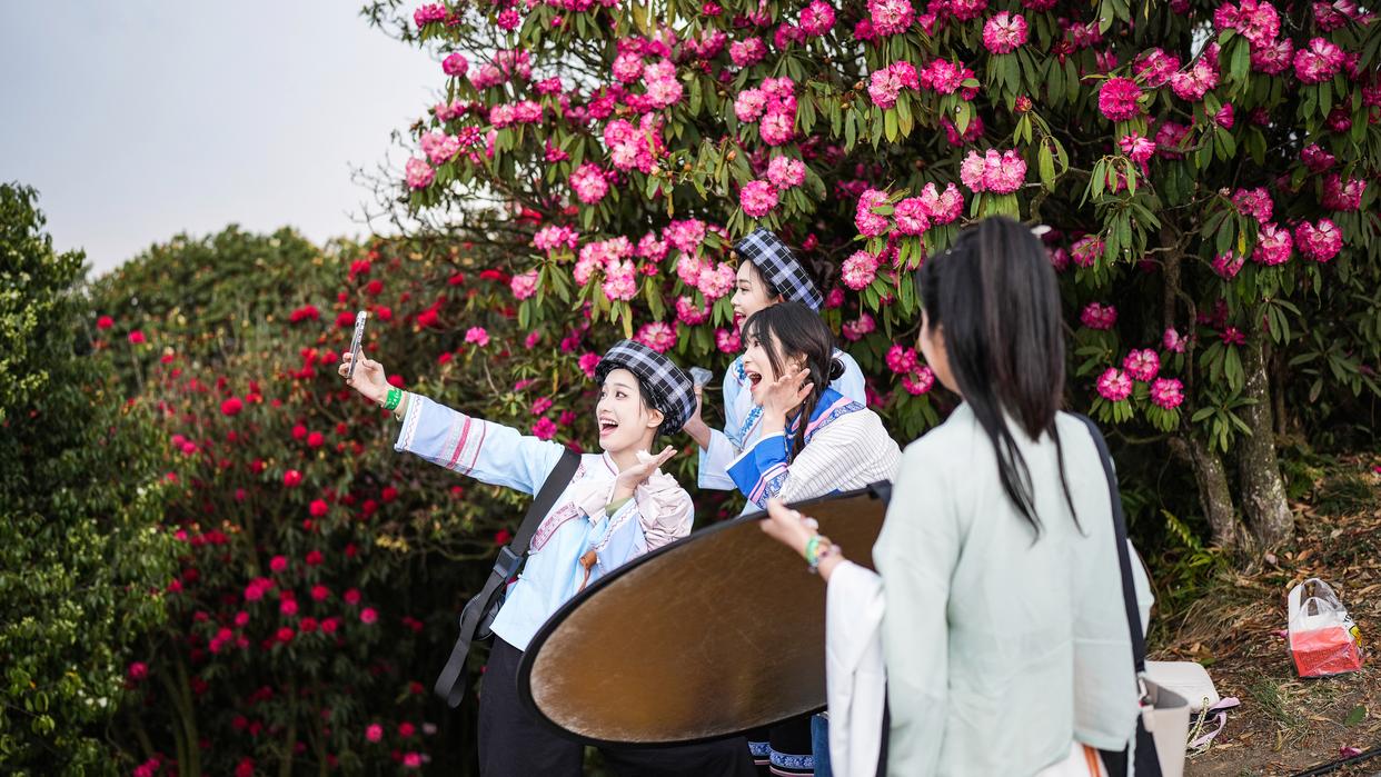 游客在百里杜鹃金坡景区合影留念