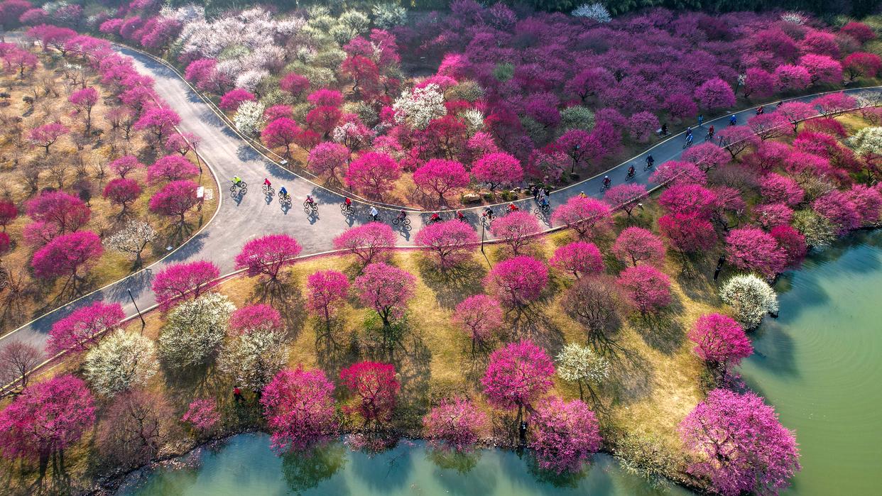 骑行爱好者们在浙江省湖州市长兴县太湖龙之梦东方盆景园骑行赏梅