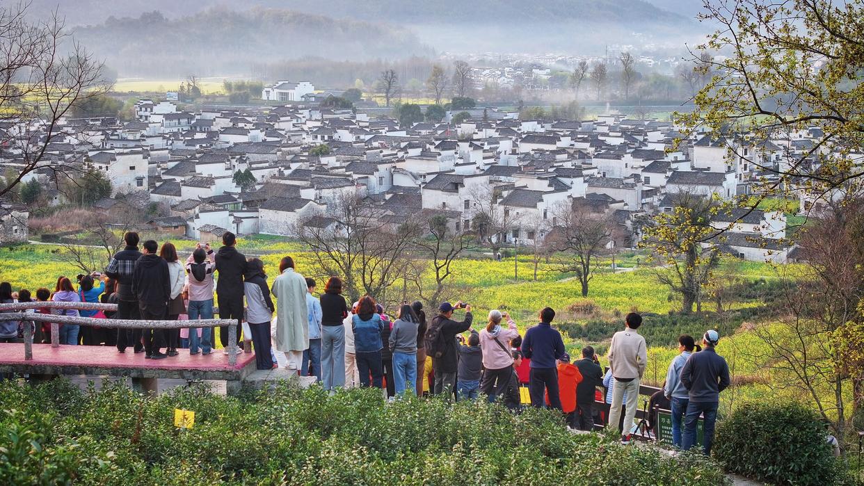 游客在安徽省黄山市黟县宏村镇卢村拍摄油菜花田和徽派古民居