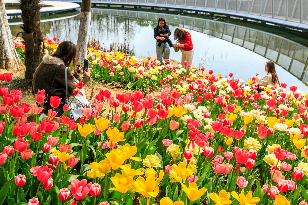 ↑2026年3月11日,游客在安徽省芜湖市神山公园观赏郁金香。CICPHOTO/陶海金 摄