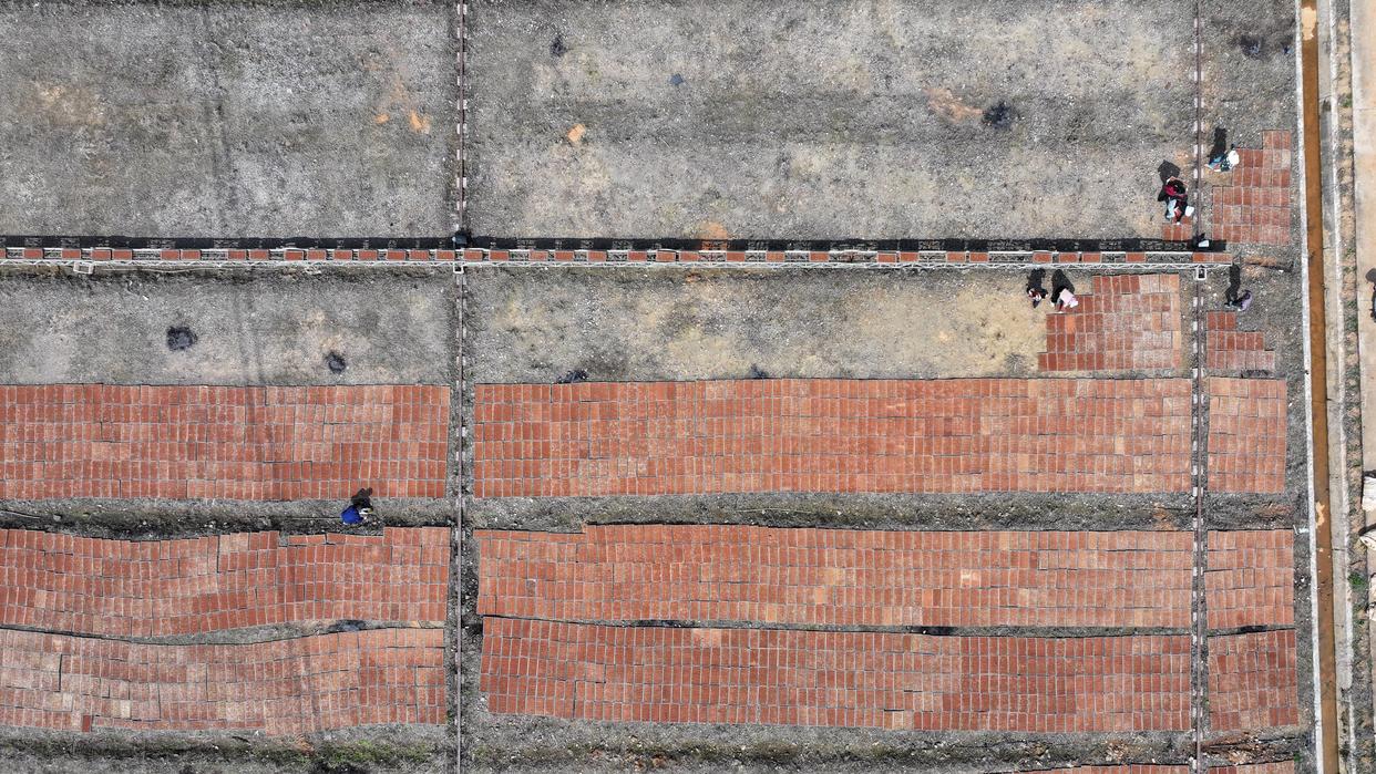 3月12日,在岳阳市岳阳县筻口镇丰瑞农机专业合作社,农民在田间摆放早稻秧盘(无人机照片)。新华社记者 陈振海 摄