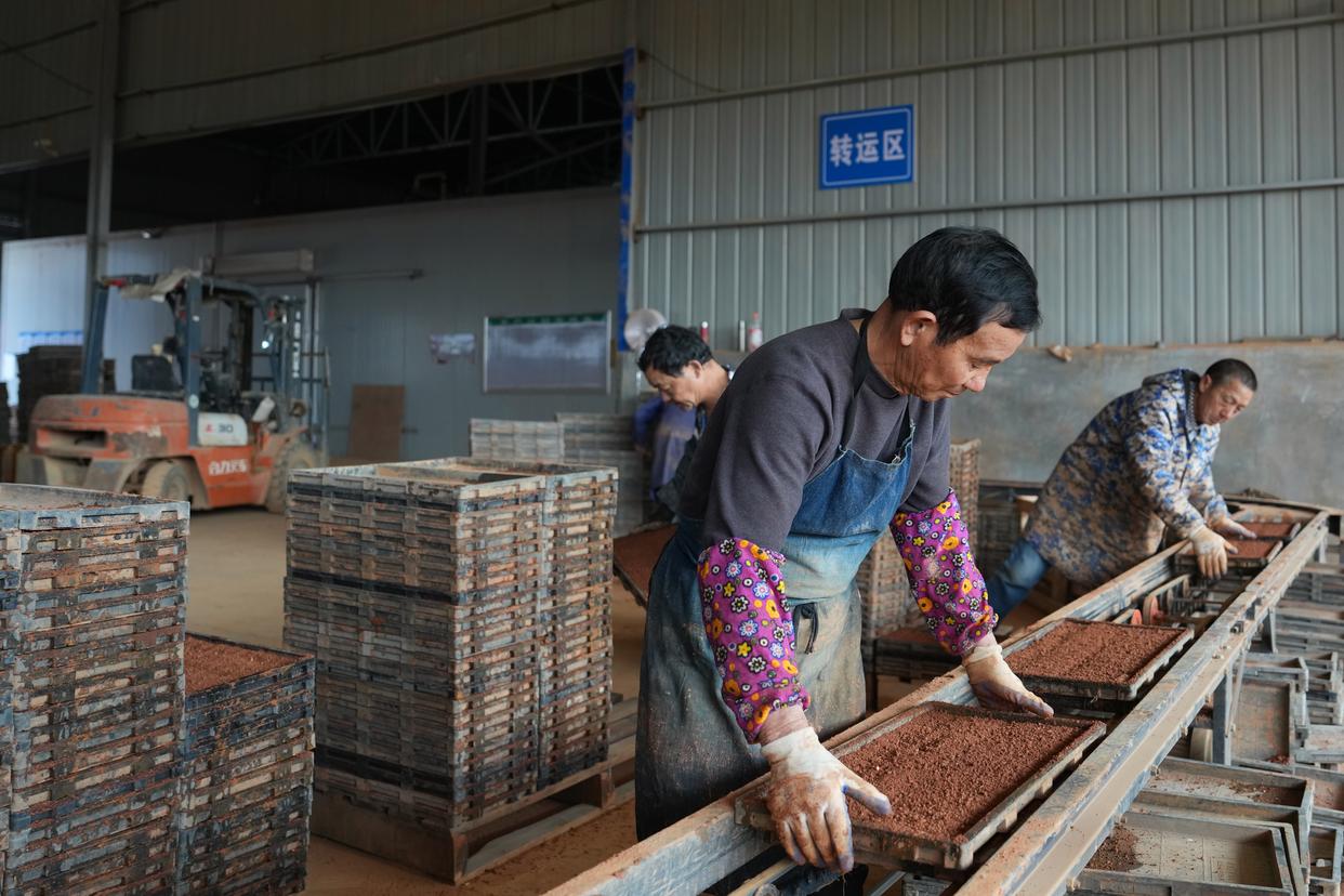 3月12日,在岳阳市汨罗县罗江镇,农民在育秧大棚内摆放早稻秧盘。新华社记者 陈振海 摄