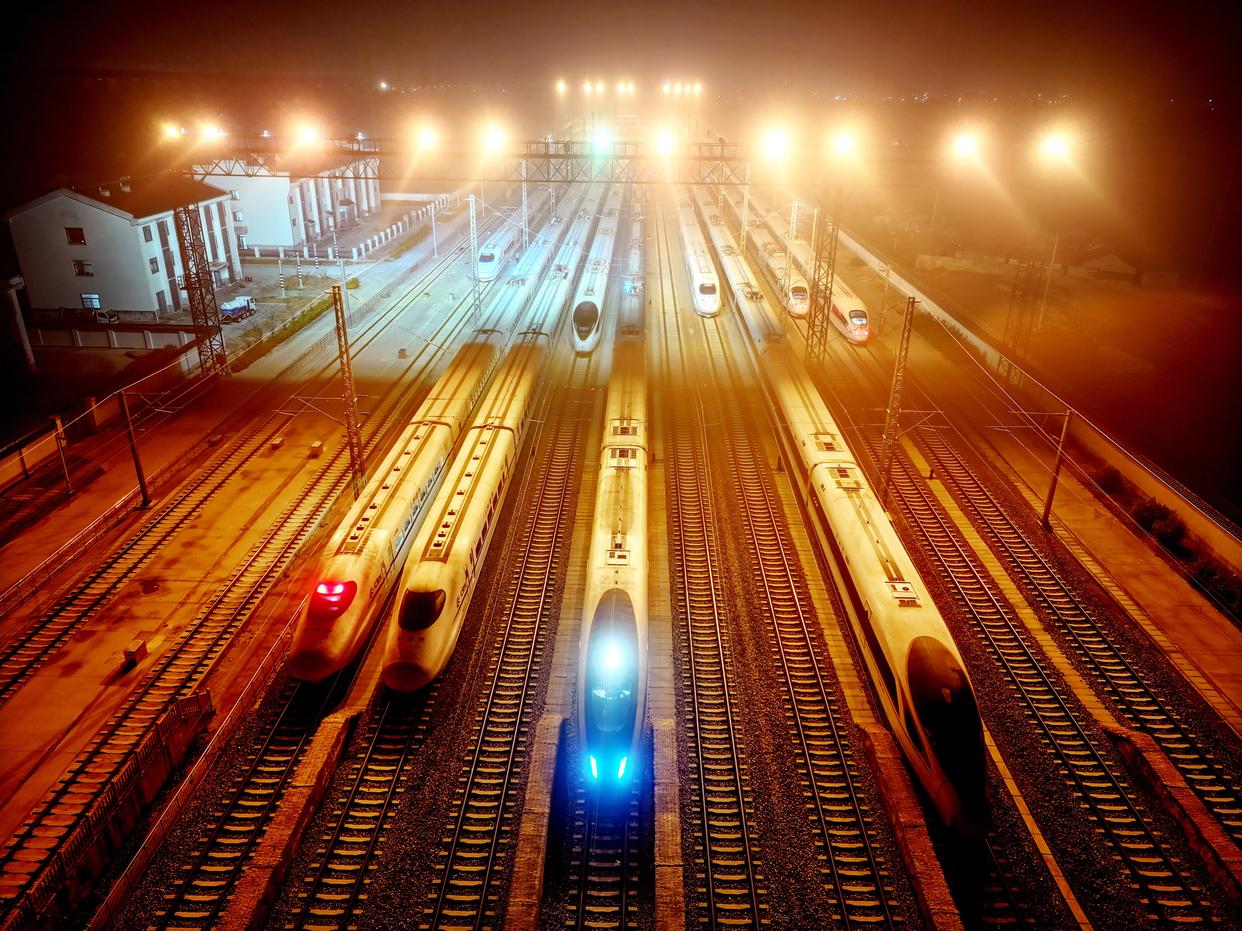 3月13日,动车组列车在江苏省连云港站等待发车(无人机照片)。新华社发(王春 摄)
