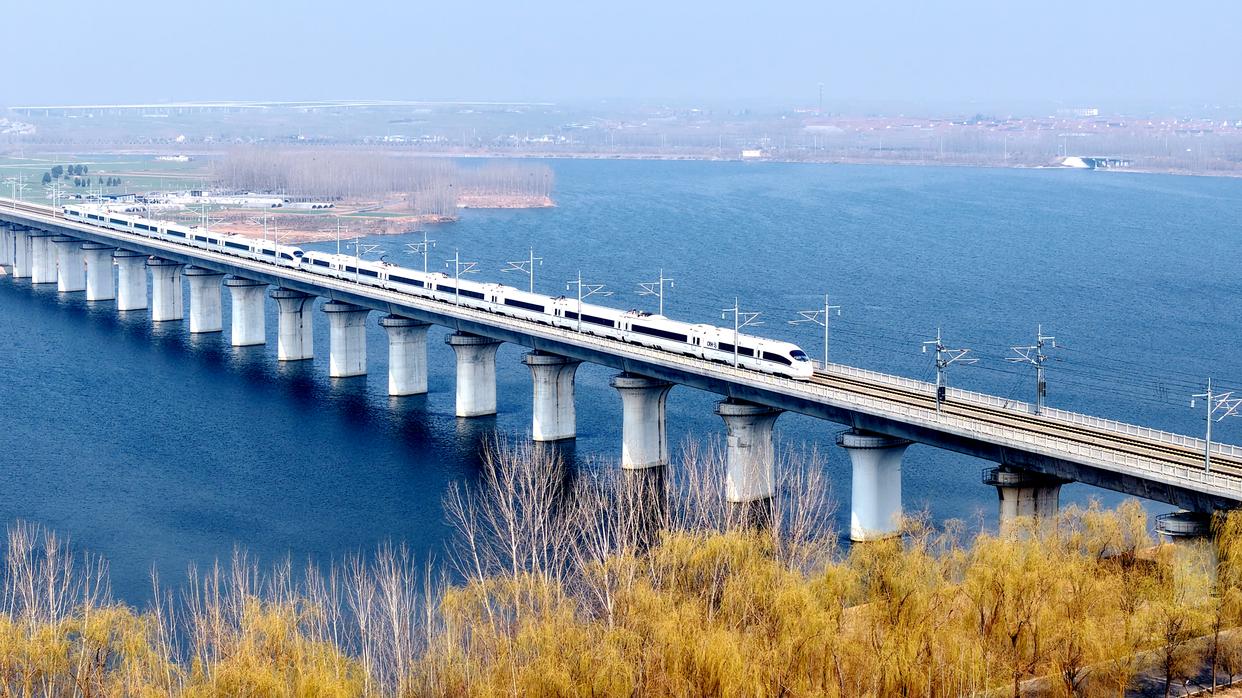 3月13日,动车组列车行驶在天津市境内(无人机照片)。新华社发(杜鹏辉 摄)