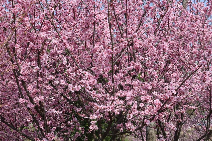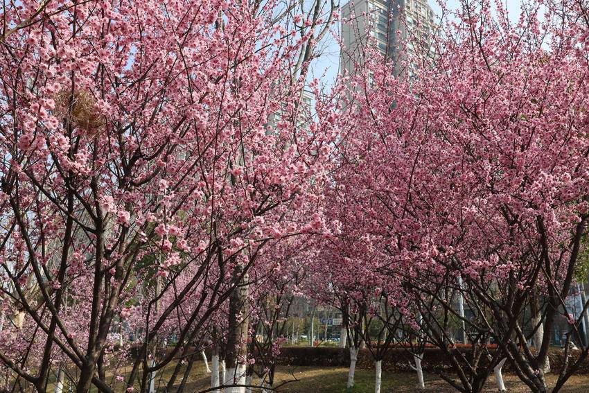 枝头繁花次第绽放,粉白相间、姹紫嫣红,与碧水蓝天相映成画。