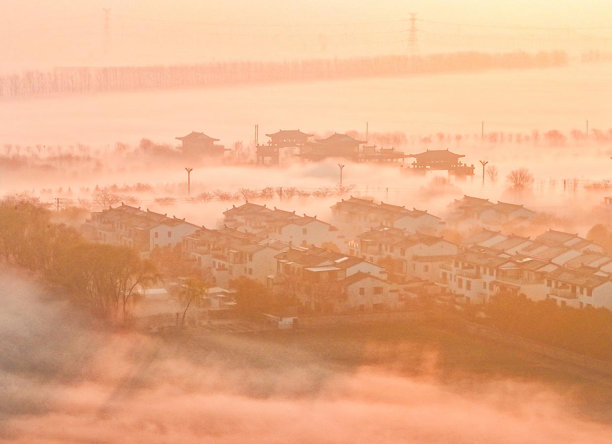 近日,江苏省宿迁市泗洪县石集乡晨雾缭绕,薄雾轻纱笼罩水面,古汴河畔如诗如画。