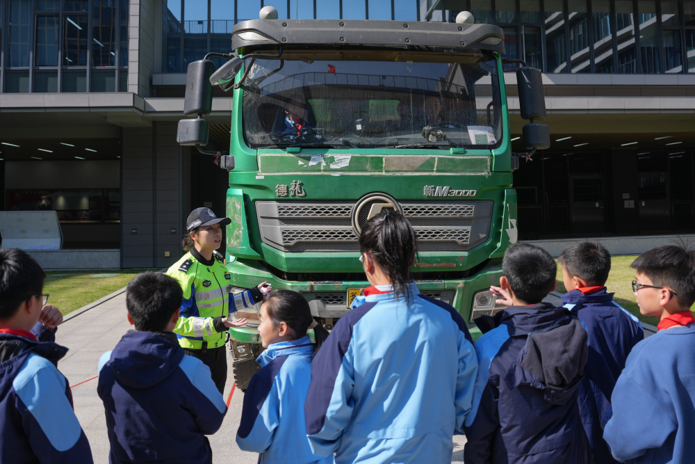 3月13日,杭州市公安局交通管理支队警官就大型车辆安全风险点指导青少年如何远离盲区、安全避让。新华社记者 黄宗治 摄