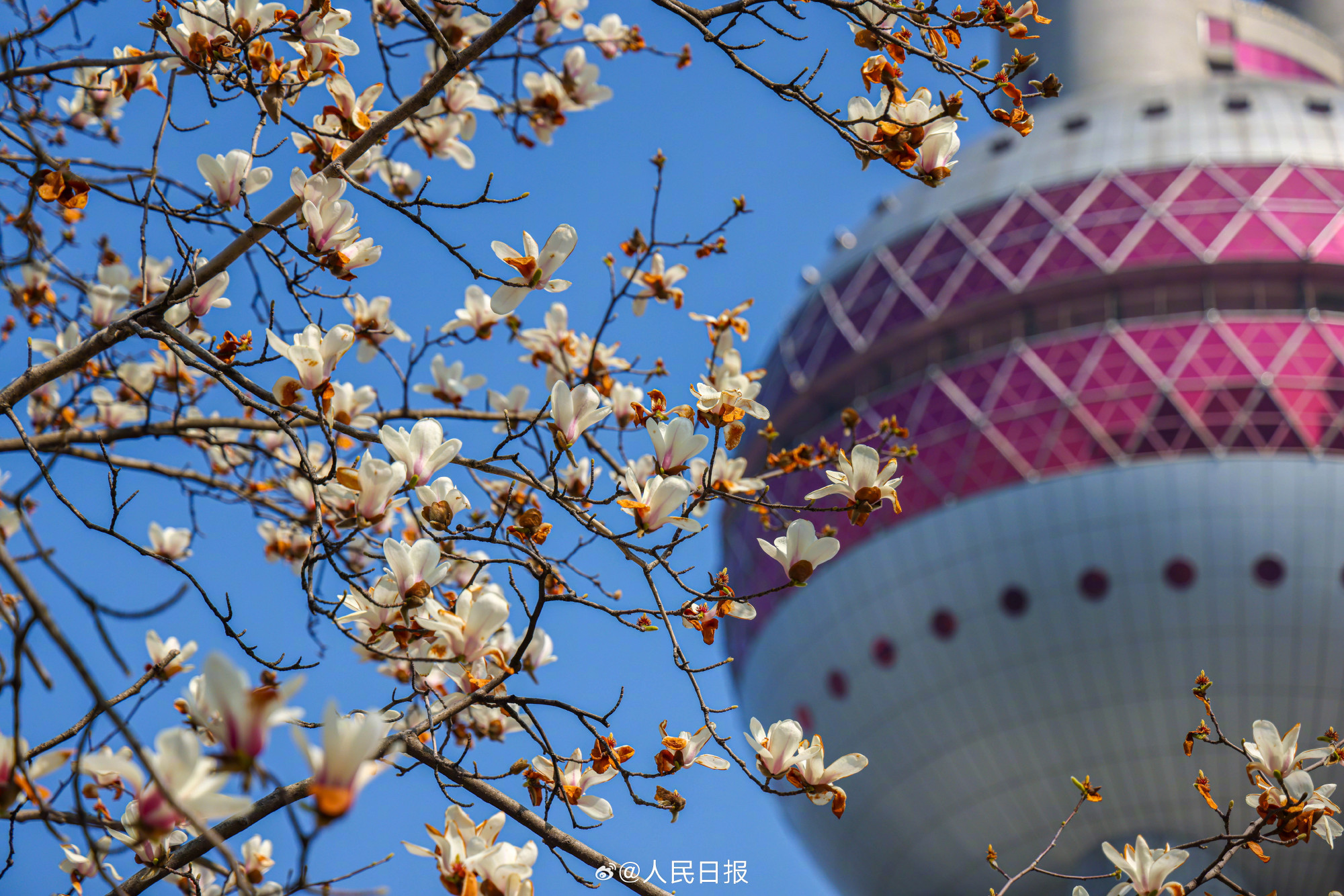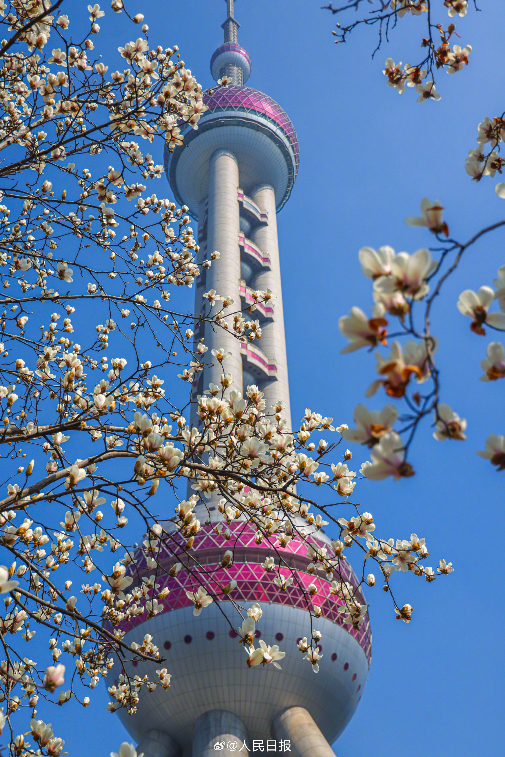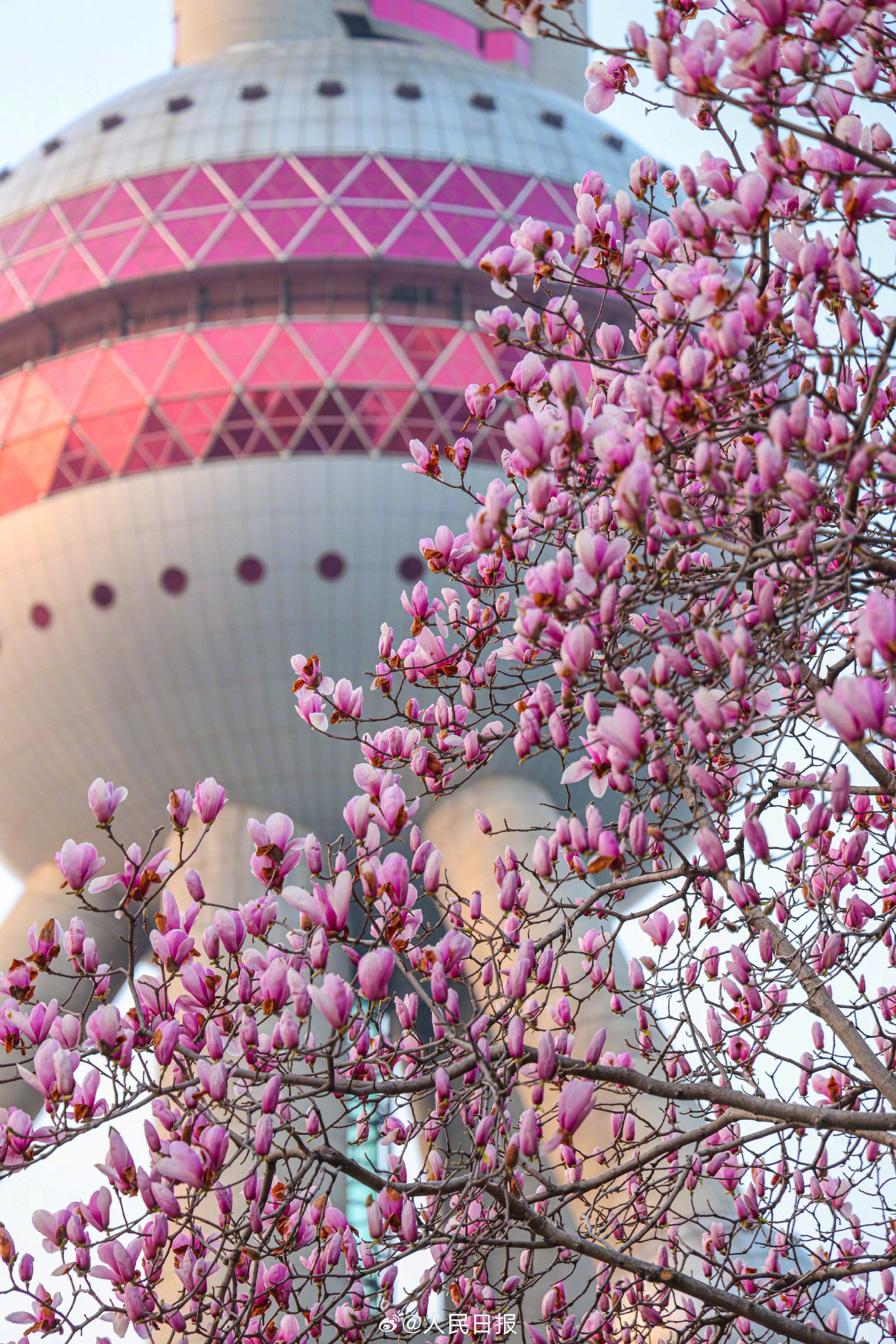 春日限定美景!玉兰与东方明珠塔同框
