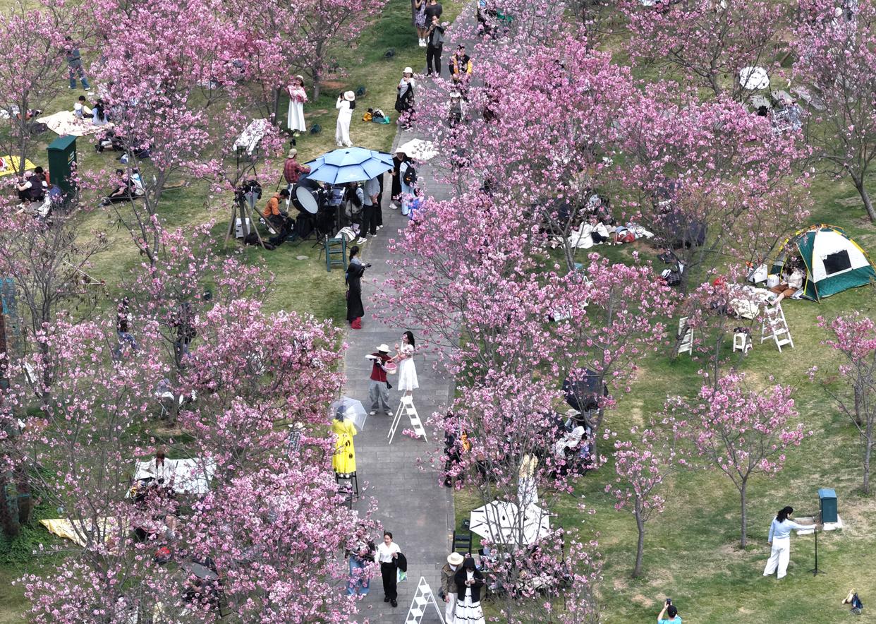 3月14日,市民在广西南宁市青秀山风景区樱花园赏花(无人机照片)。新华社记者 周华 摄