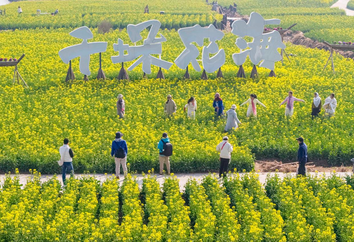 3月14日,江苏省兴化市千垛景区开园迎客,游客在景区内赏花游玩(无人机照片)。新华社发(汤德宏摄)